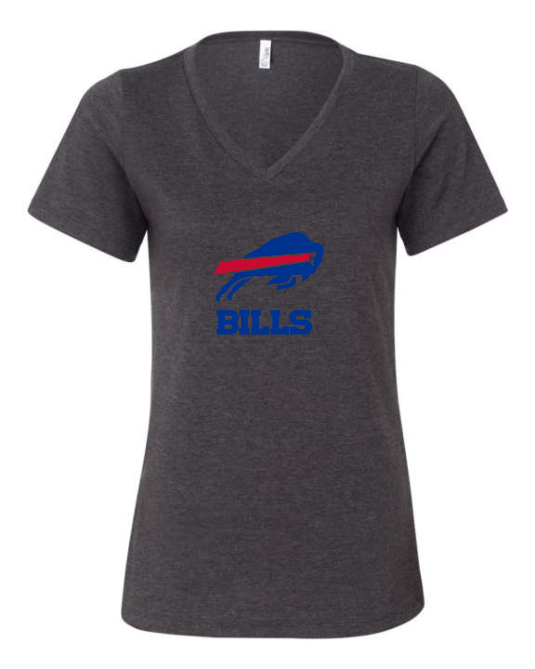 Show your team pride in style with this Buffalo Bills inspired women’s v-neck t-shirt featuring the iconic charging buffalo logo. Perfect for football season, game days, tailgating, watch parties, and everyday fan wear, this graphic tee lets you represent your team with confidence and comfort.