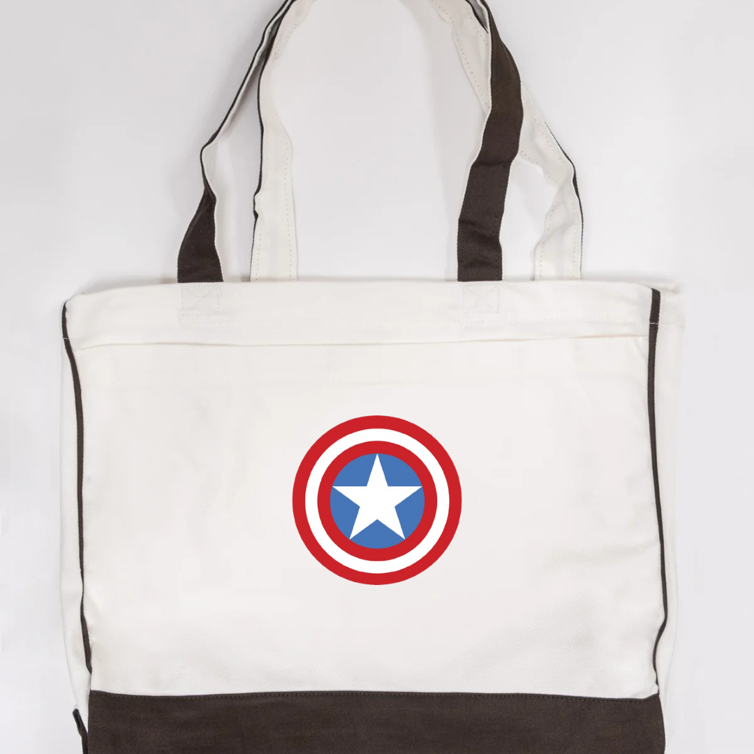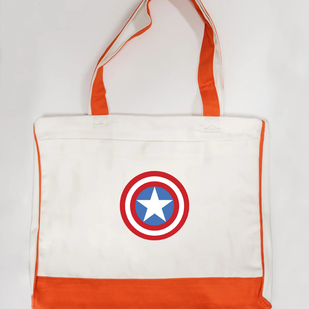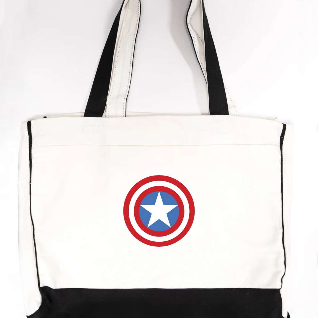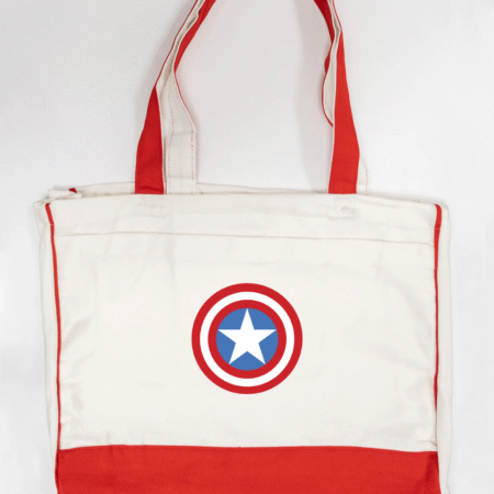 Channel heroic style with our Captain America Shield Trimmed Tote Bag. Featuring the legendary red, white, and blue shield logo, this tote is the perfect blend of superhero spirit and everyday practicality. Made with durable fabric and accented with sleek black trimming, it offers plenty of space for your essentials while staying lightweight and sturdy. Ideal for shopping, school, gym, or casual outings, this tote brings a touch of Marvel-inspired power to your daily routine.