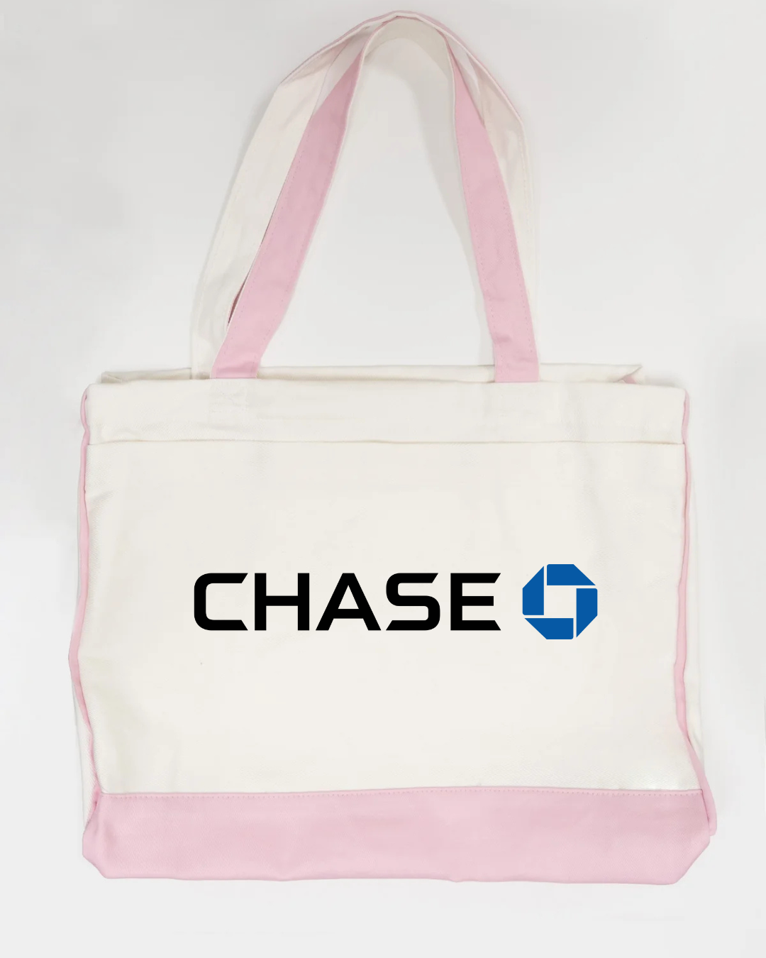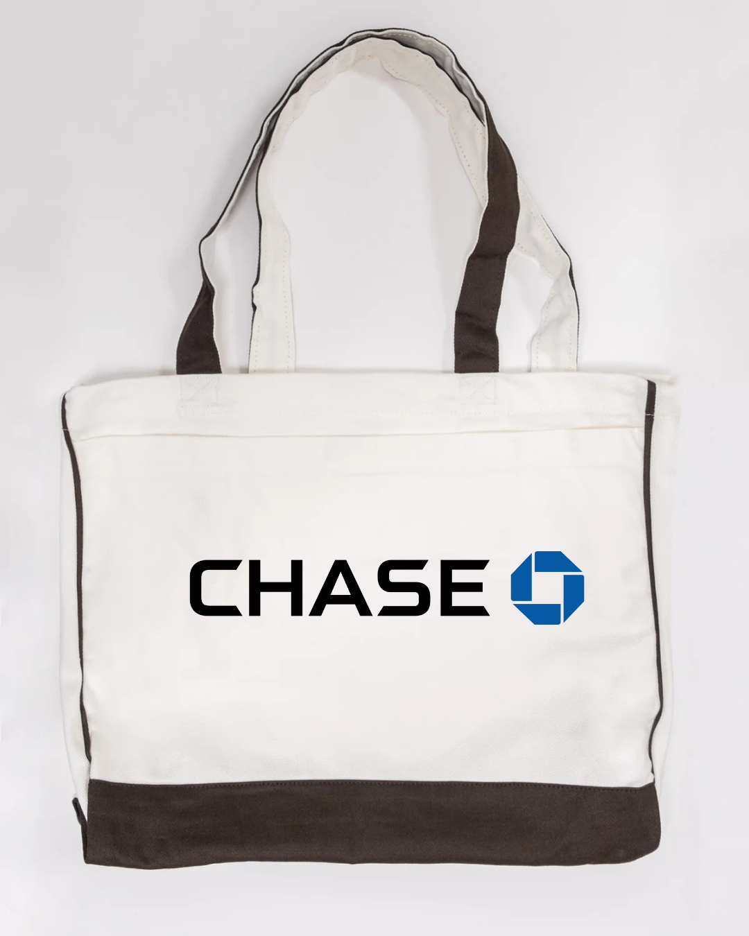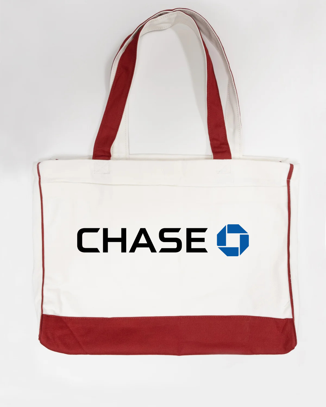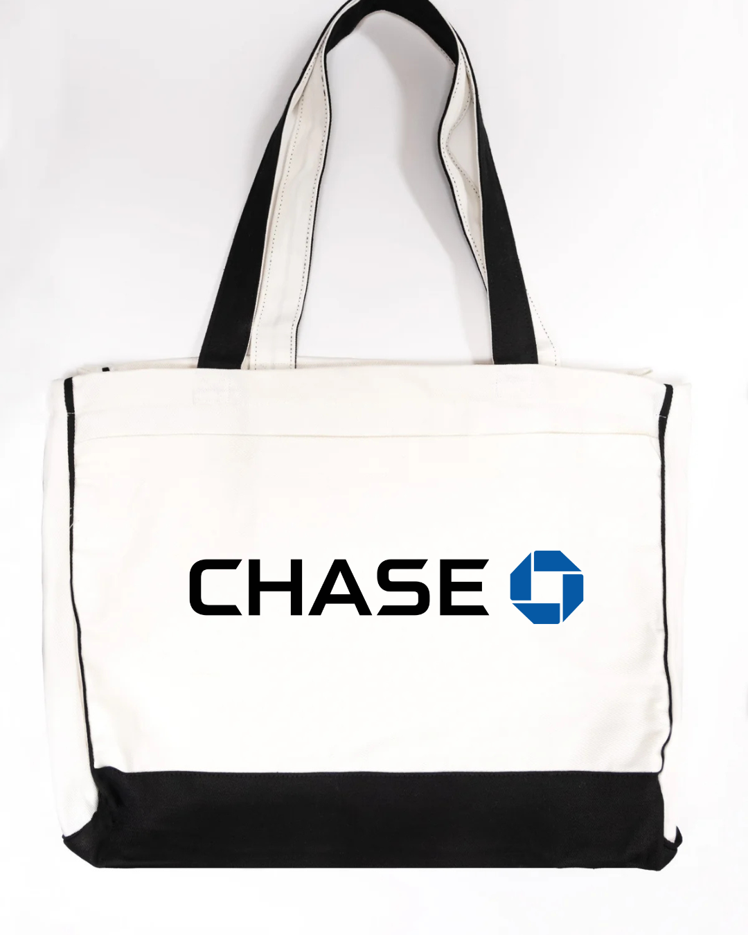 Carry a sleek financial-brand look with our Chase Bank Logo Trimmed Tote Bag. Featuring the iconic Chase octagon logo with wordmark, this tote blends a modern corporate style with everyday practicality. Made from durable canvas fabric and accented with clean black trimming, it offers a spacious interior perfect for work, errands, school, travel, or daily essentials. Lightweight, sturdy, and recognizable—ideal for Chase fans, employees, or anyone who appreciates strong, simple branding.