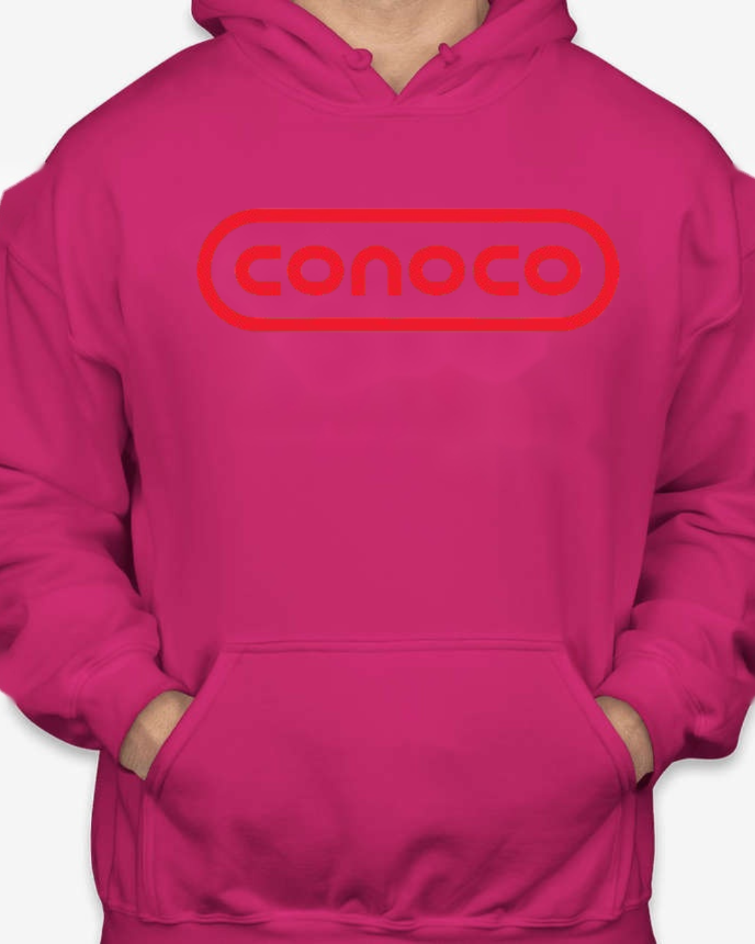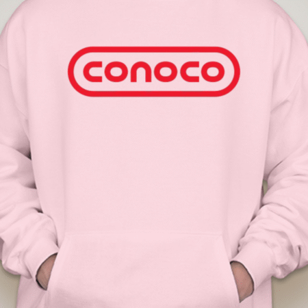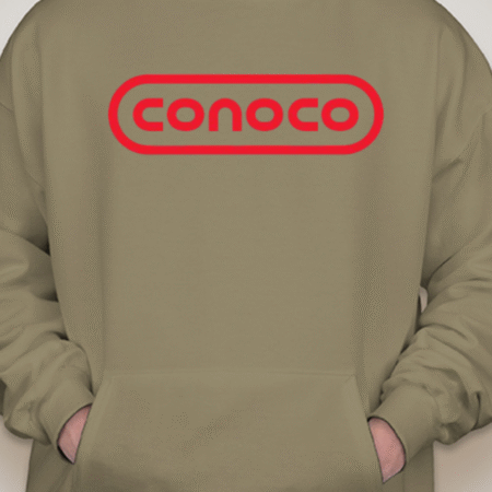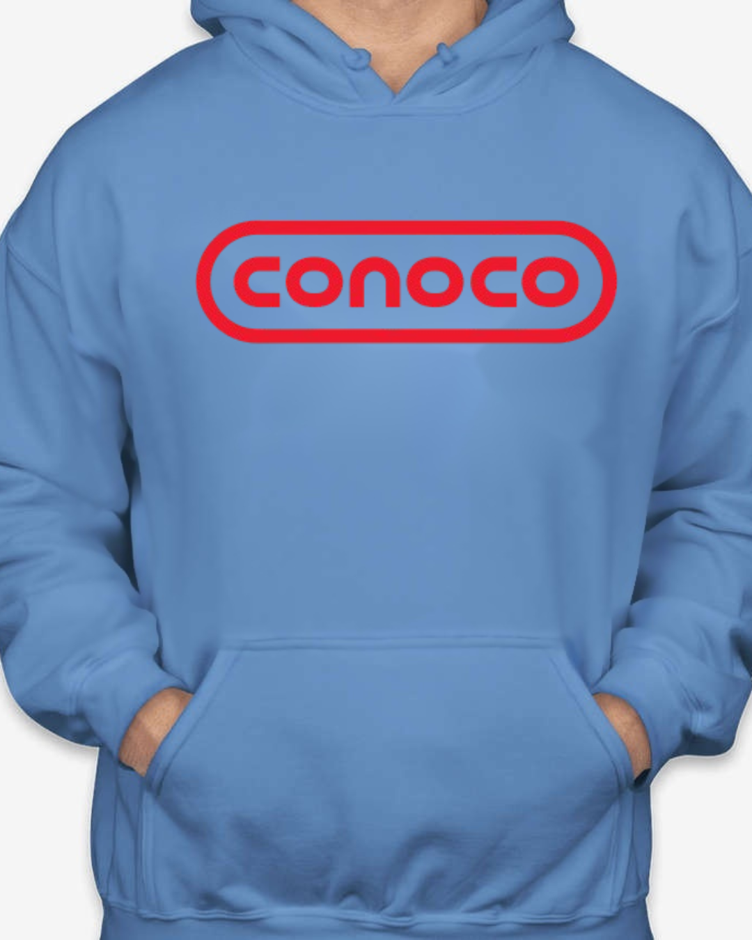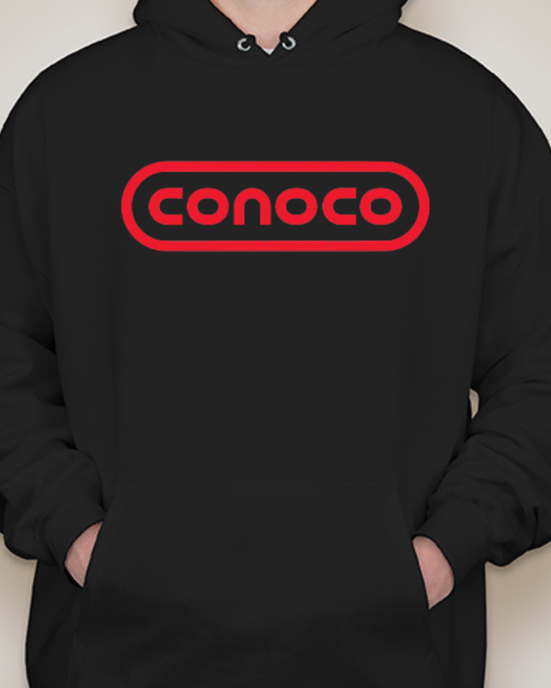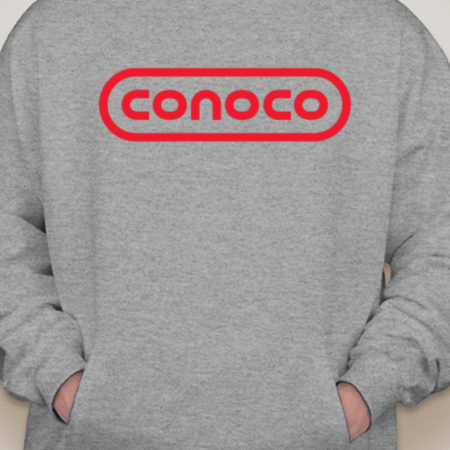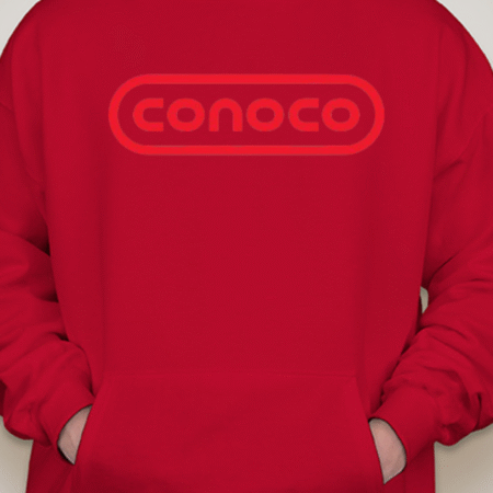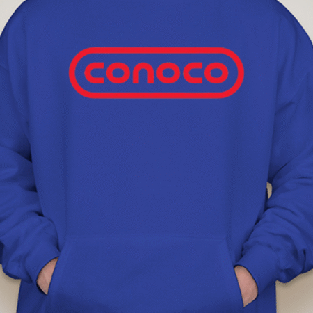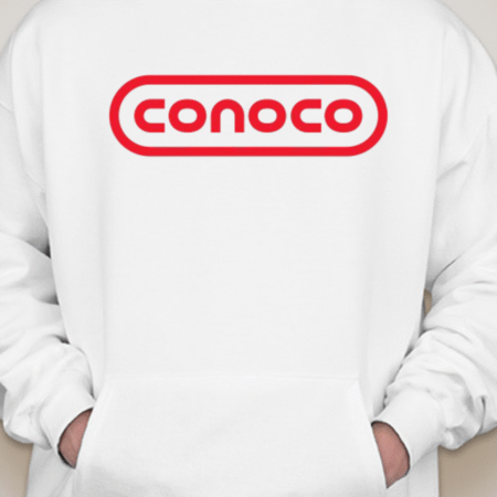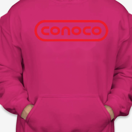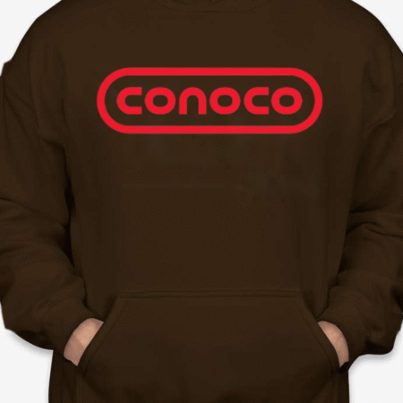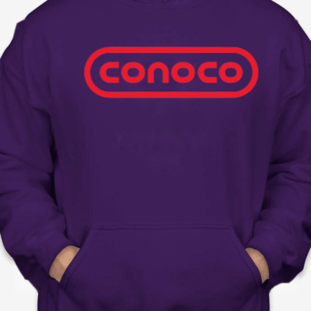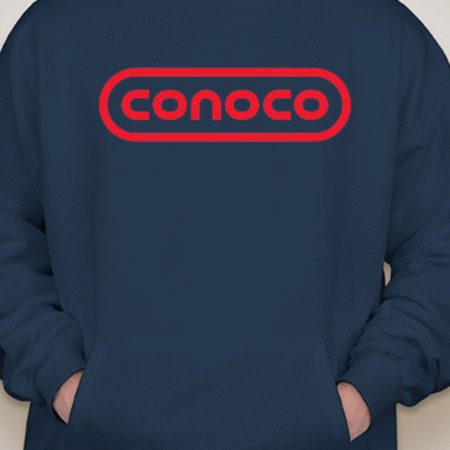 Bring retro service-station vibes to your lineup with this Classic Conoco Logo Unisex Pullover Hoodie. The bold rounded-rectangle wordmark sits front and center for clean vintage style, while soft Gildan fleece keeps it cozy for road trips, garage days, or everyday streetwear. Printed crisp with long-lasting color. Sizes S–2XL.