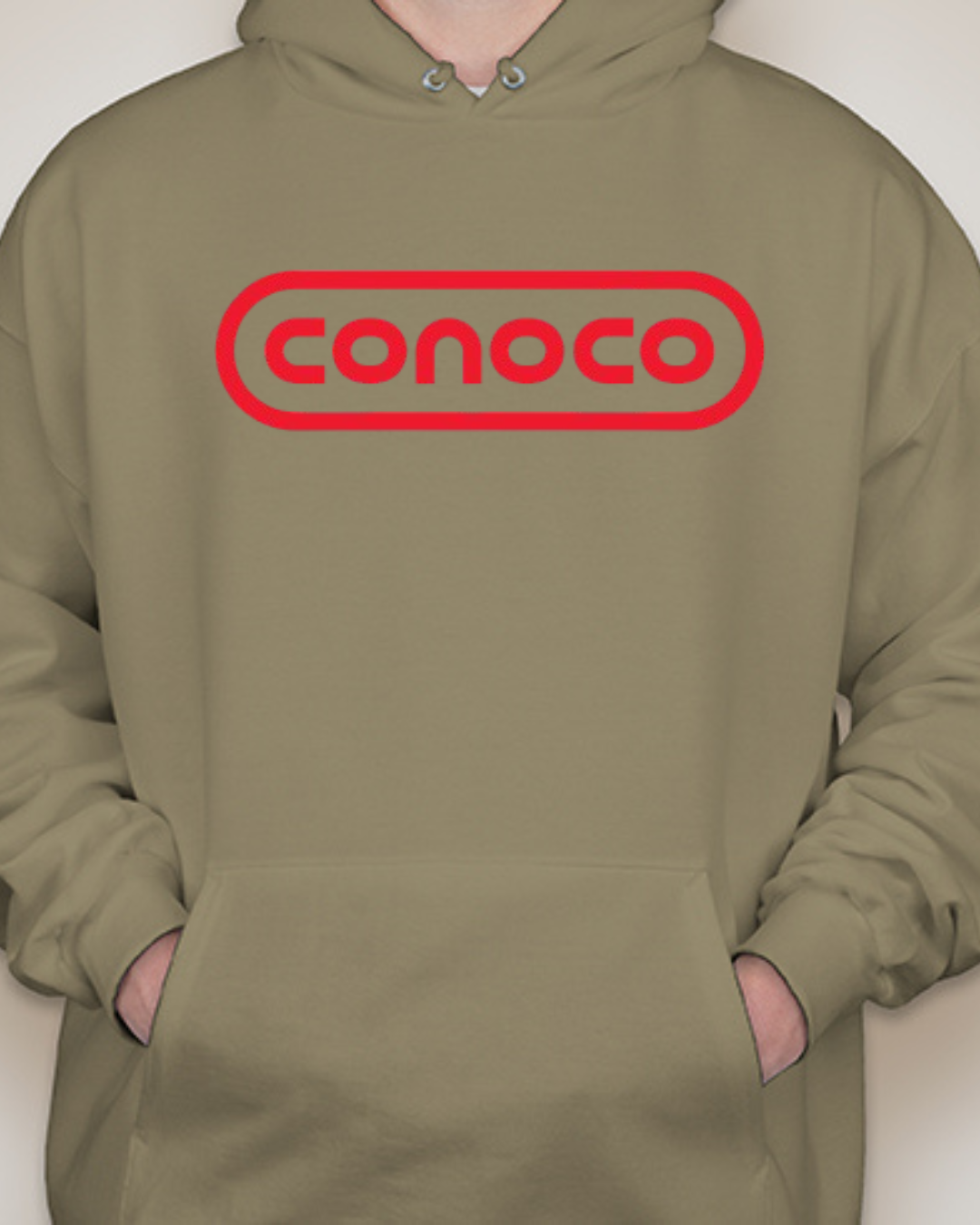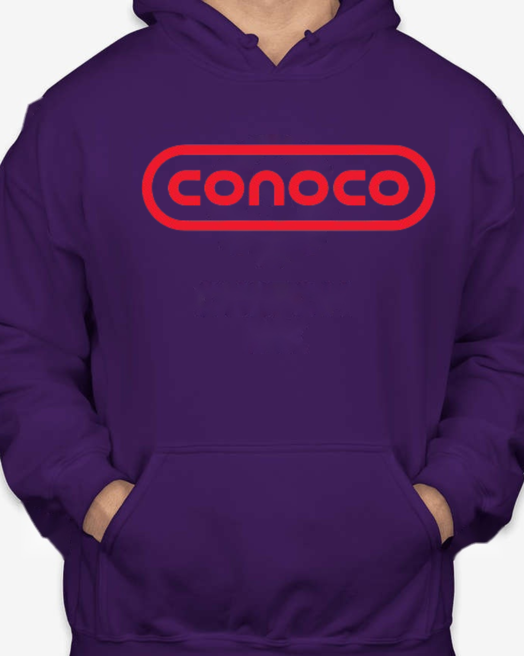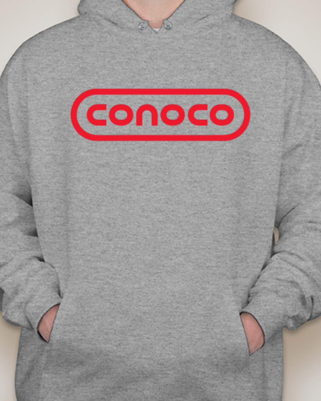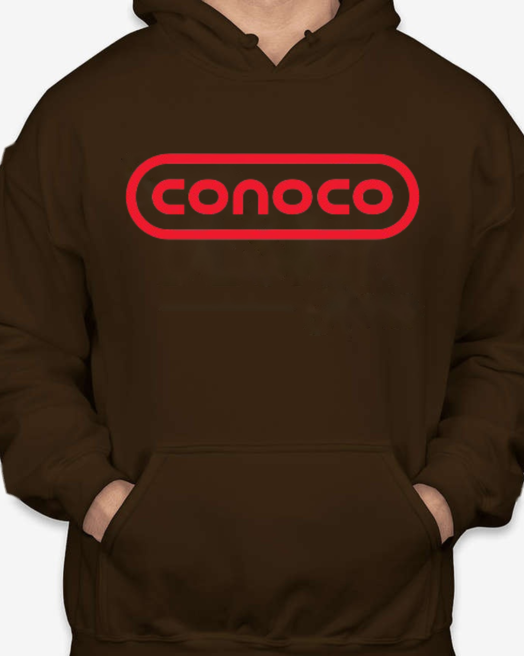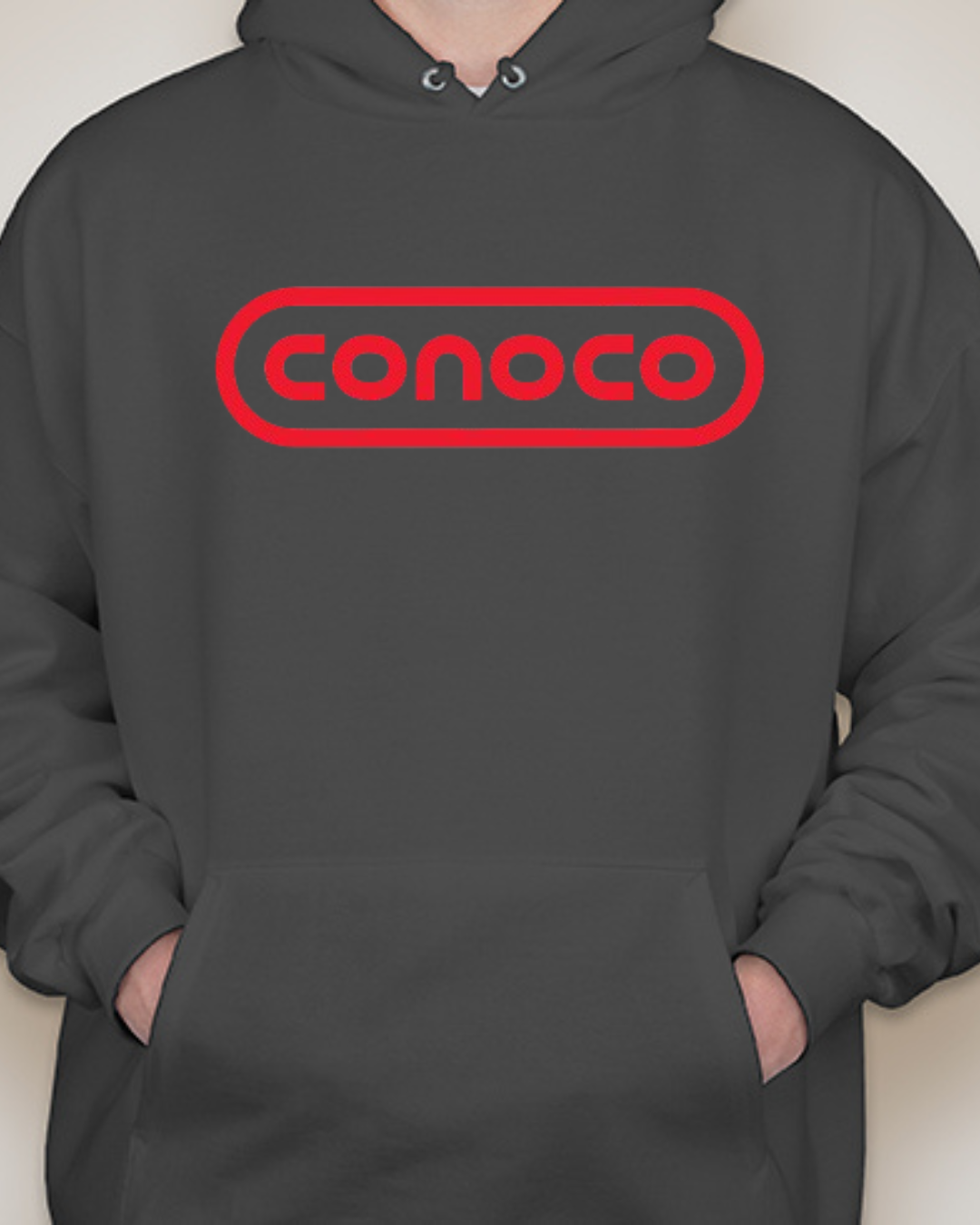 Bring retro service-station vibes to your lineup with this Classic Conoco Logo Unisex Pullover Hoodie. The bold rounded-rectangle wordmark sits front and center for clean vintage style, while soft Gildan fleece keeps it cozy for road trips, garage days, or everyday streetwear. Printed crisp with long-lasting color. Sizes S–2XL.