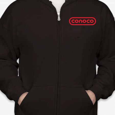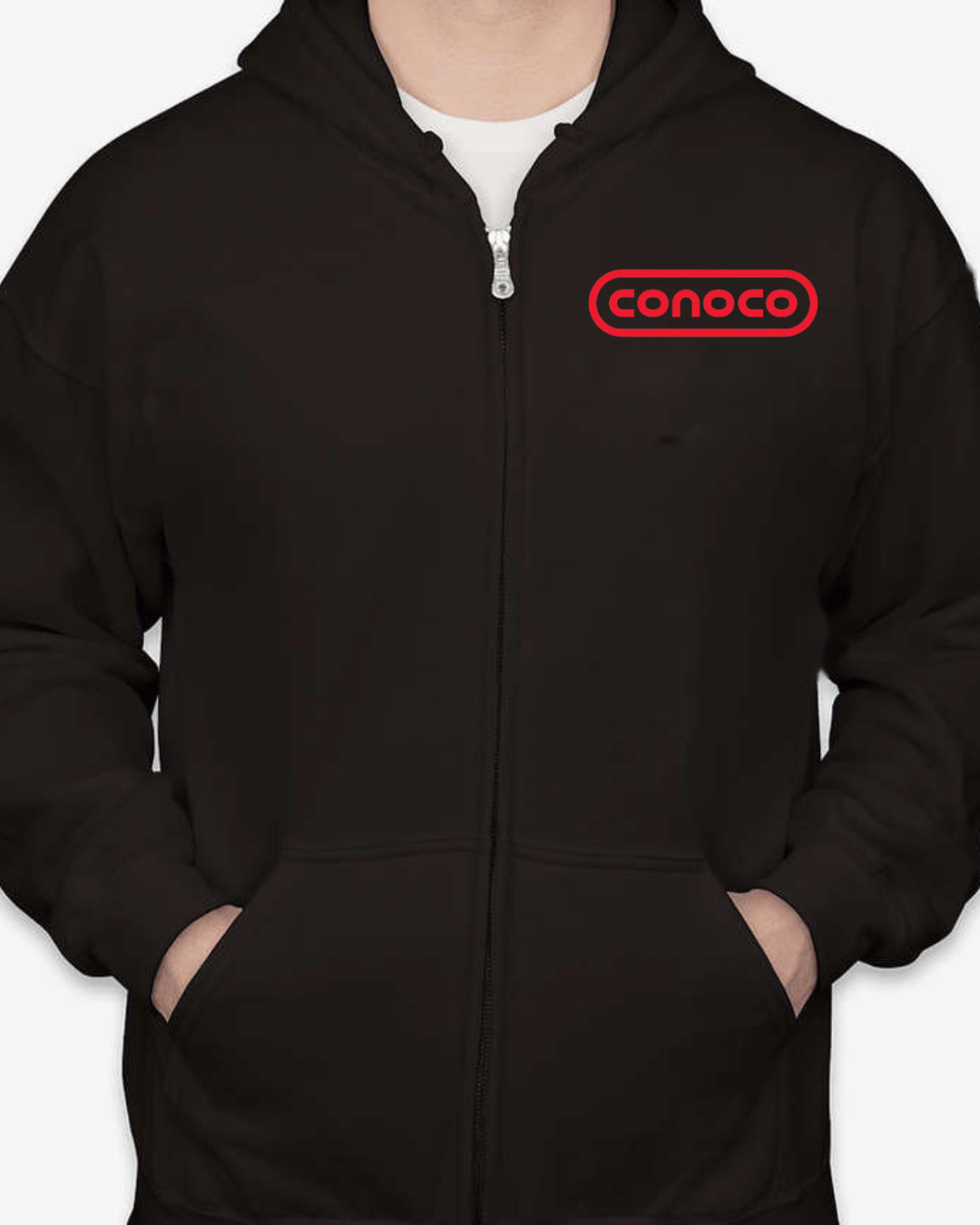 Throw it back with vintage energy in this Conoco Gasoline Logo Zip-Up Hoodie. Showcasing the classic red Conoco emblem on the chest, this hoodie pays homage to a legendary name in American oil history. Designed for fans of retro automotive branding and classic fuel culture, it’s perfect for everyday wear with a bold, nostalgic twist. Available in sizes S to 2XL.