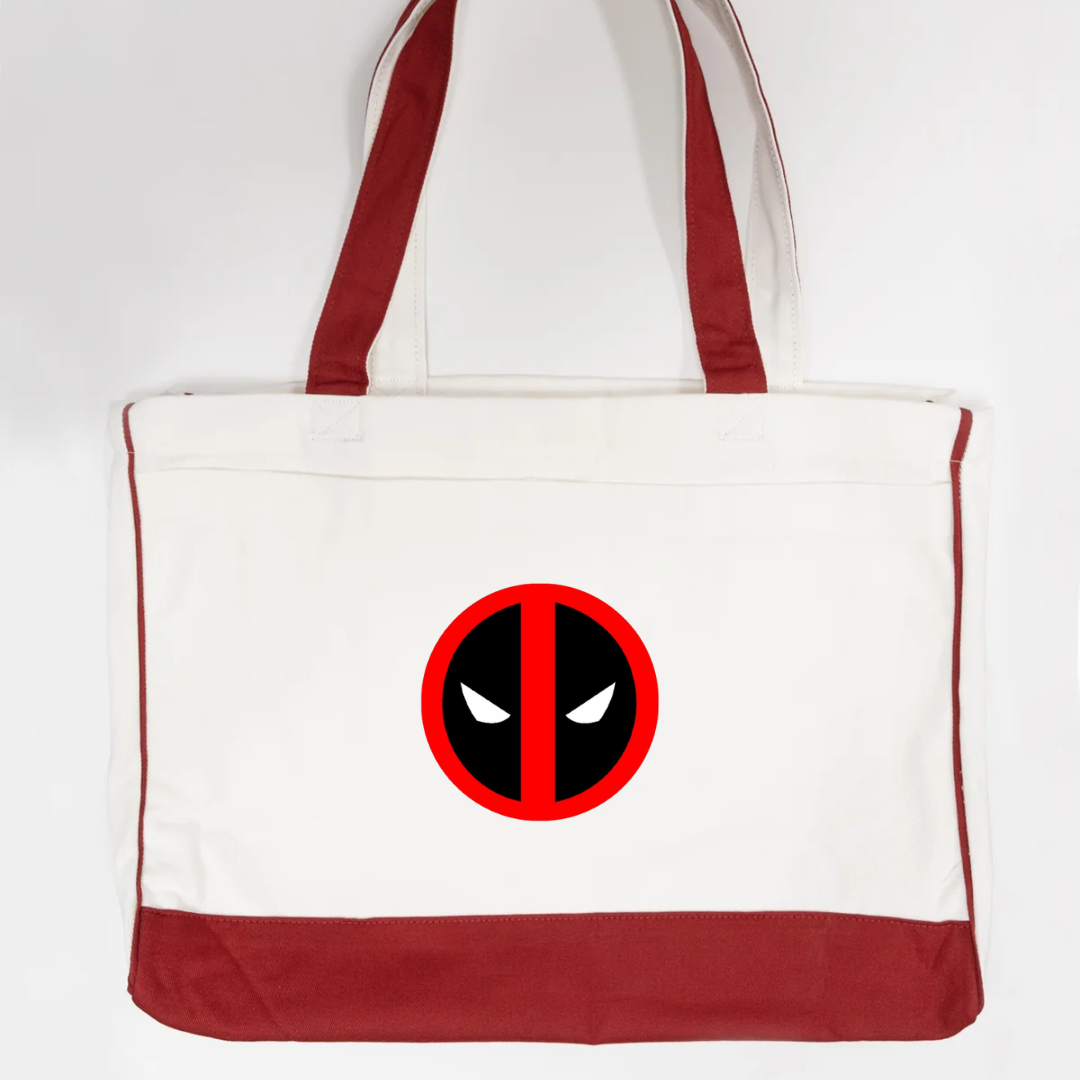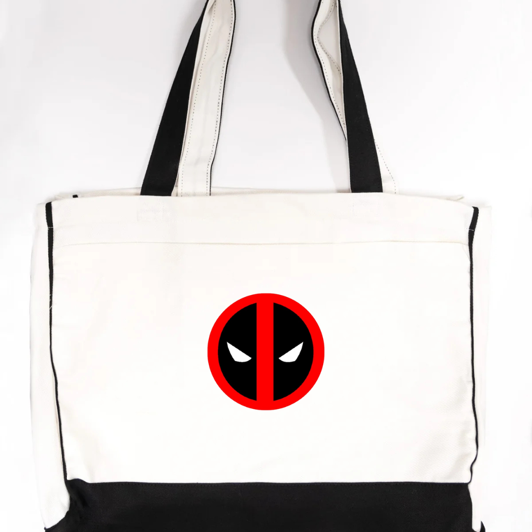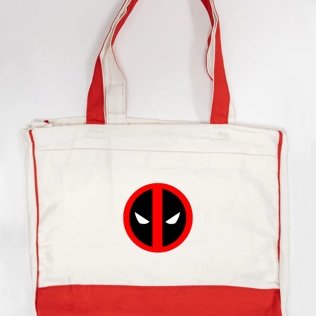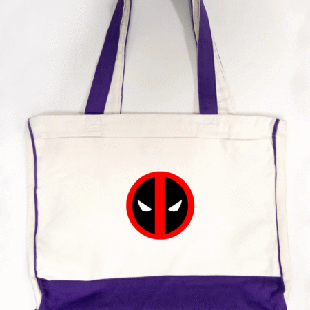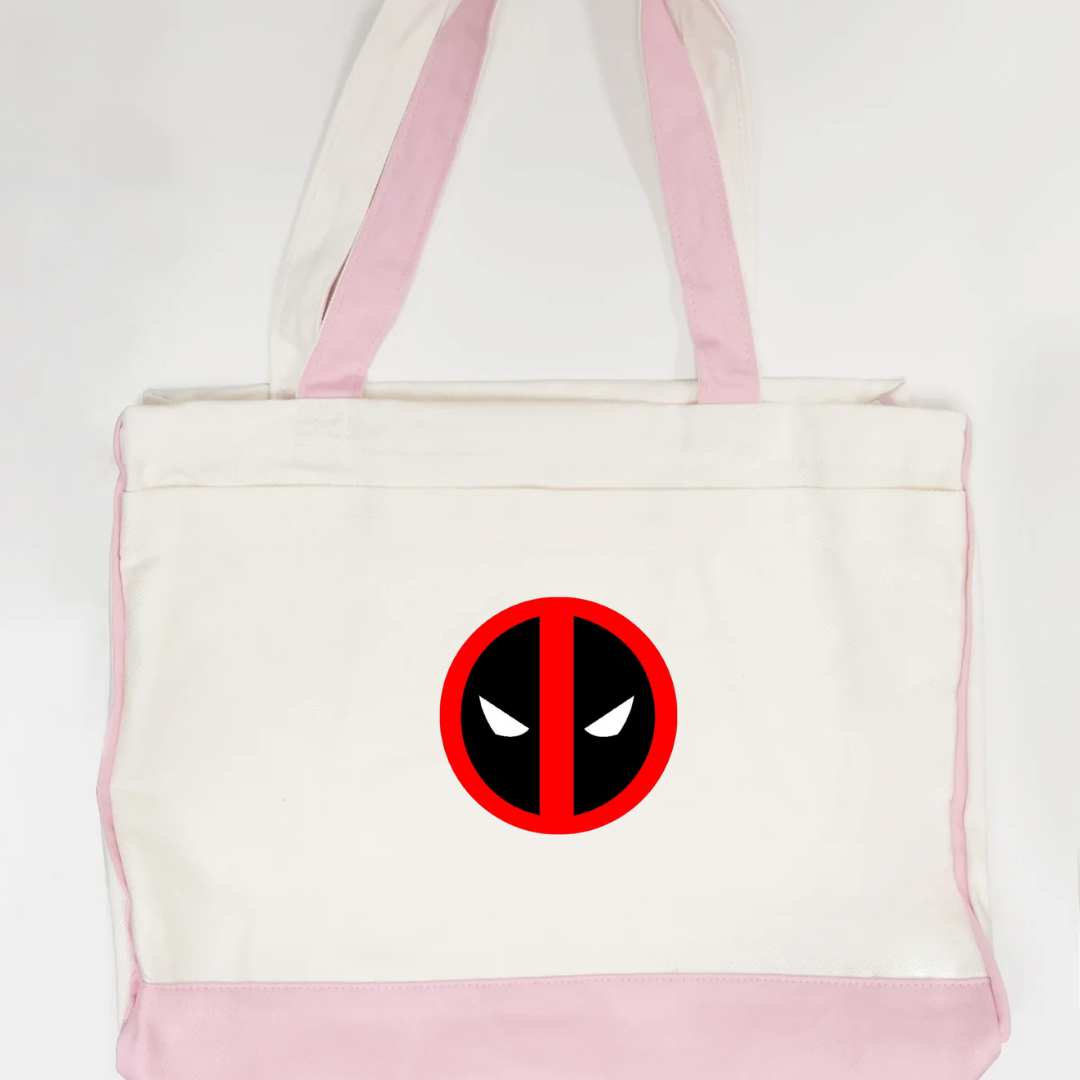 Add some attitude to your everyday carry with our Deadpool Logo Trimmed Tote Bag. Featuring the iconic red and black Deadpool-inspired emblem, this tote brings superhero flair to a functional design. Crafted from durable canvas fabric and accented with soft pink trimming, it’s perfect for errands, travel, school, or casual outings. Lightweight, strong, and unmistakably bold—this tote is made for fans who love style with personality.