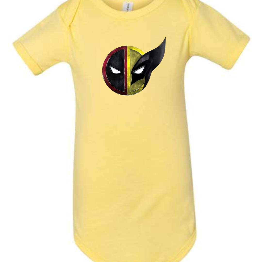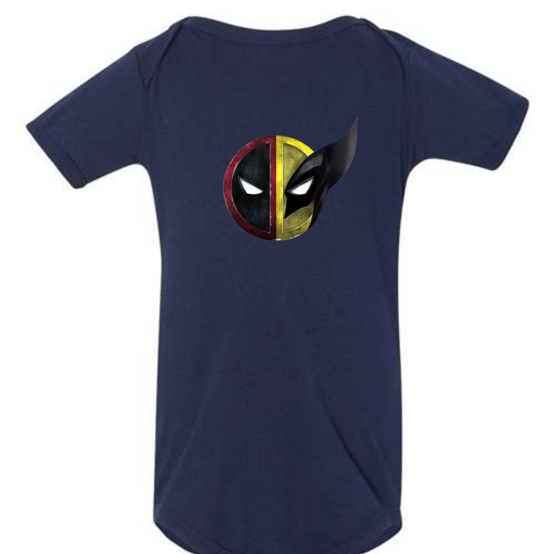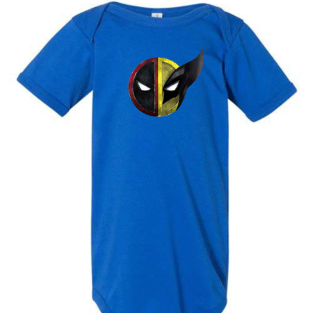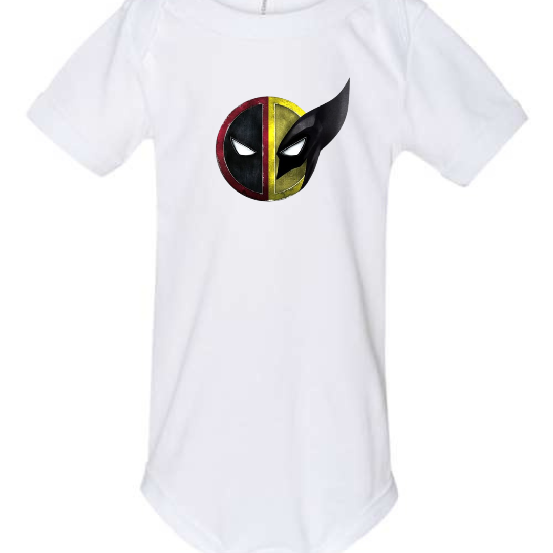 Unleash double the superhero attitude with our Deadpool & Wolverine Mashup Logo Infant Bodysuit. Featuring a bold split-face design blending the iconic looks of two Marvel legends, this one-piece is perfect for little ones with big energy and wild charm. Crafted from soft, breathable fabric with snap closures for easy changes, it’s a fierce and fun outfit for future heroes. Available in sizes 3M to 24M.