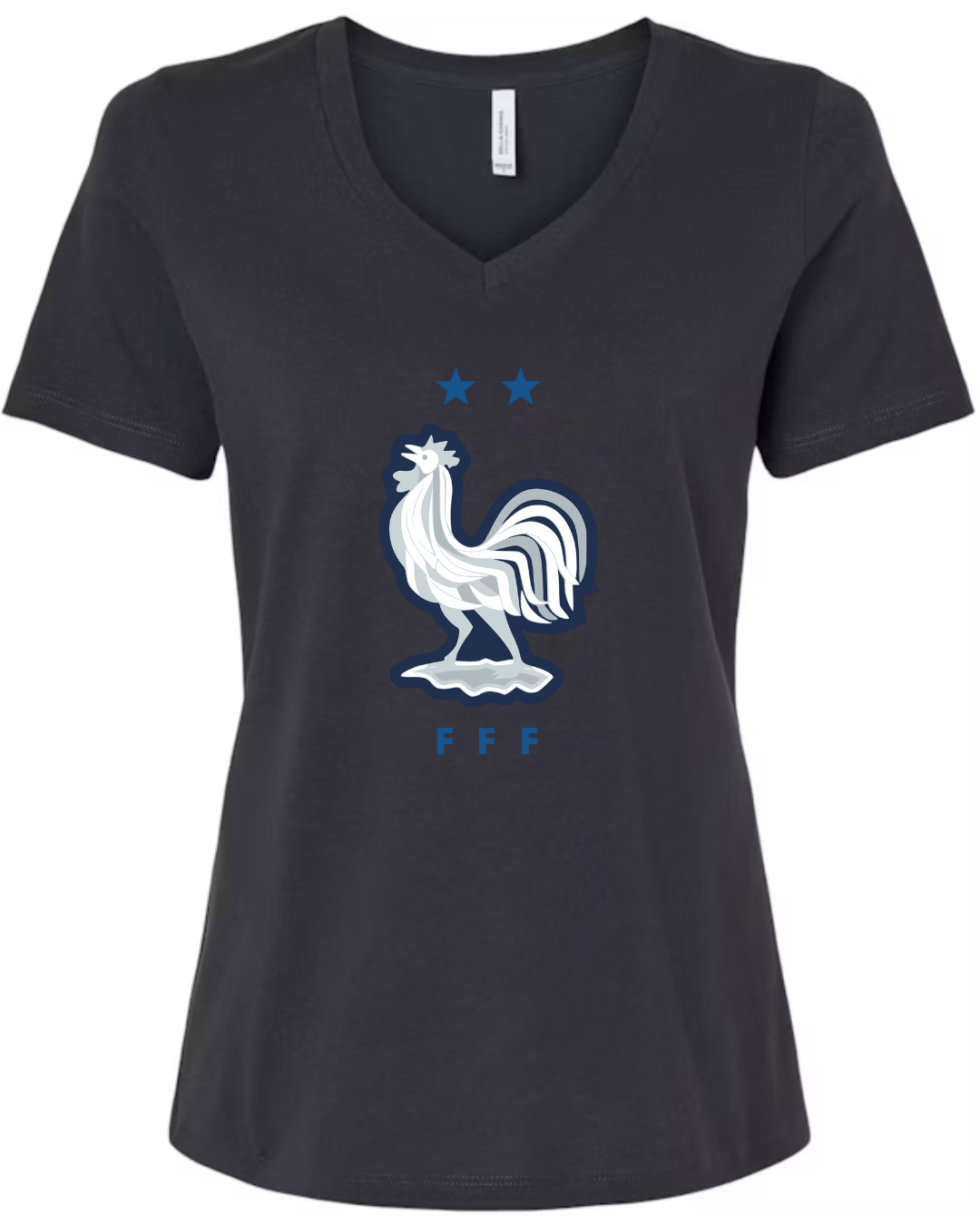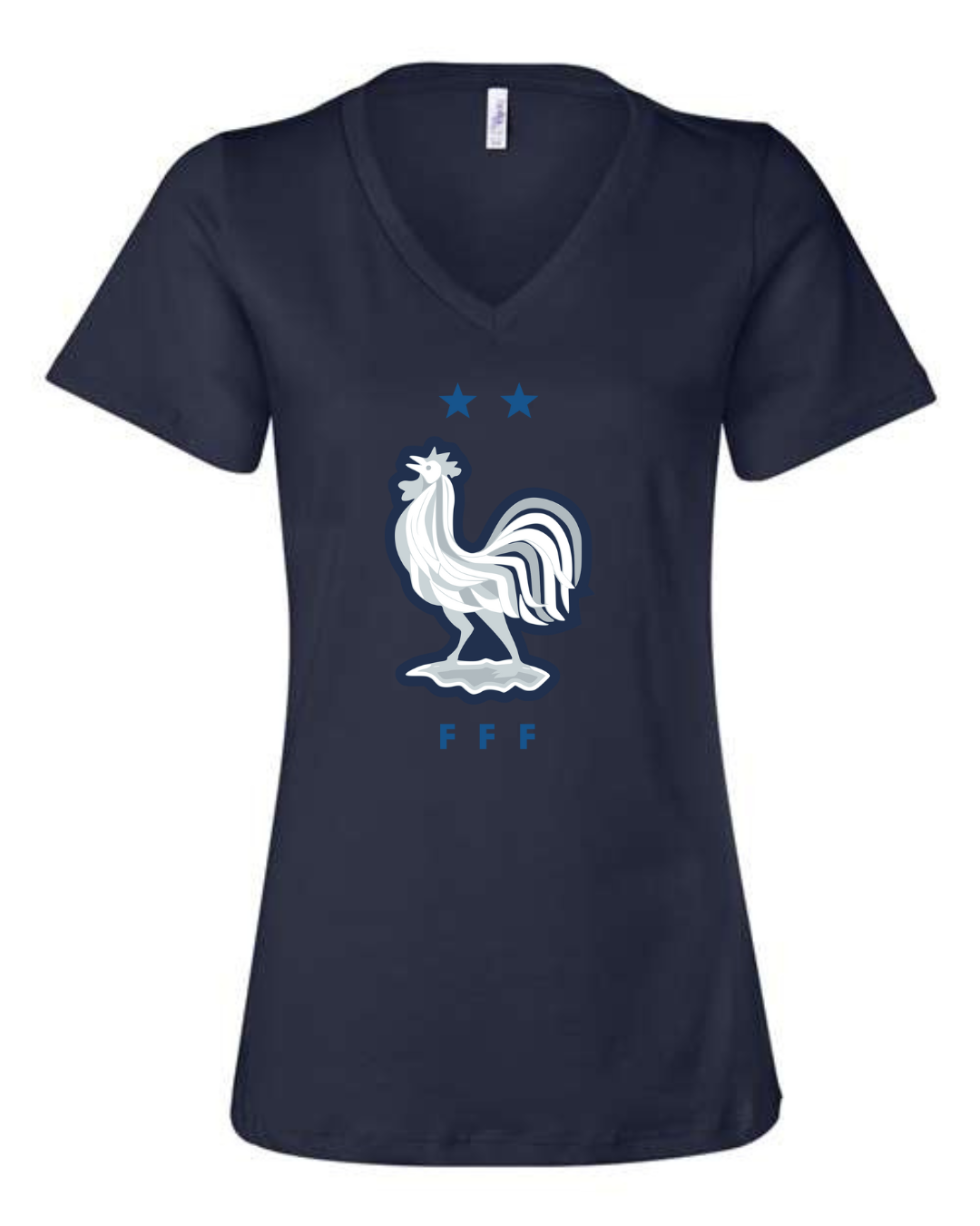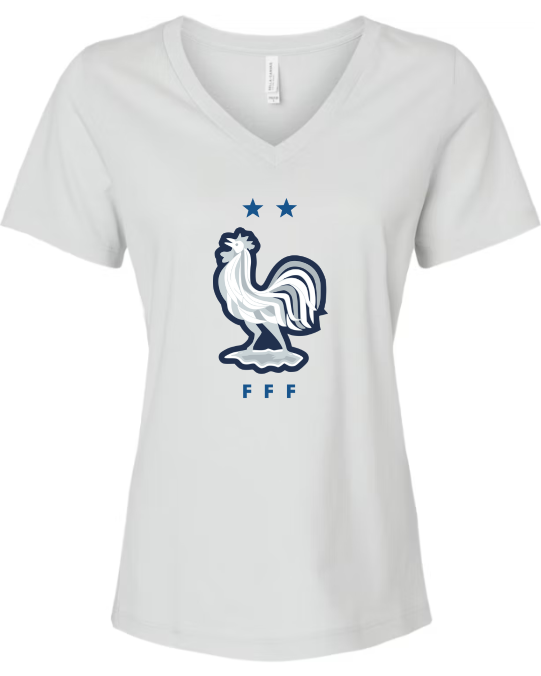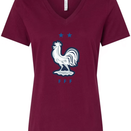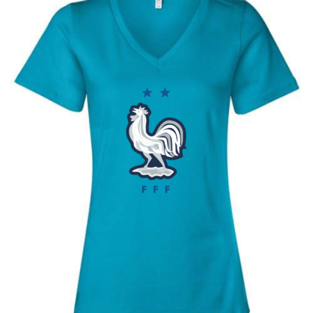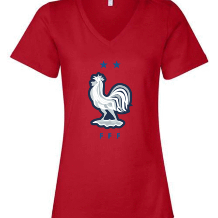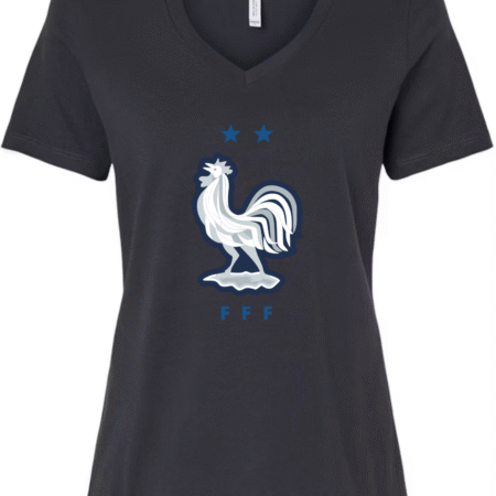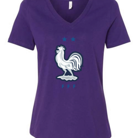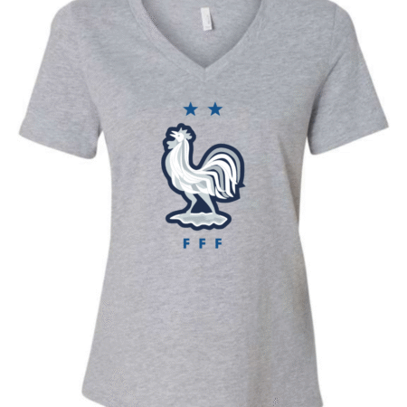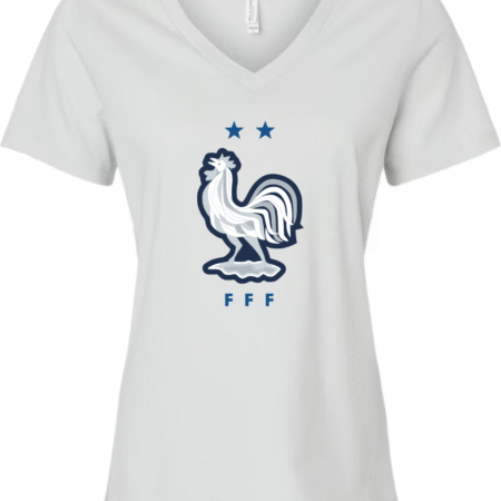 Inspired by the proud heritage of French football, this Bella Canvas Women’s V-Neck Tee features the iconic FFF rooster emblem in white and navy, accented by two stars symbolizing championship glory. Perfect for fans of Les Bleus and lovers of international football fashion, this tee blends national pride with modern style. Crafted from Bella Canvas’s ultra-soft cotton blend, it offers a flattering feminine fit and all-day comfort. Available in sizes S to 2XL.