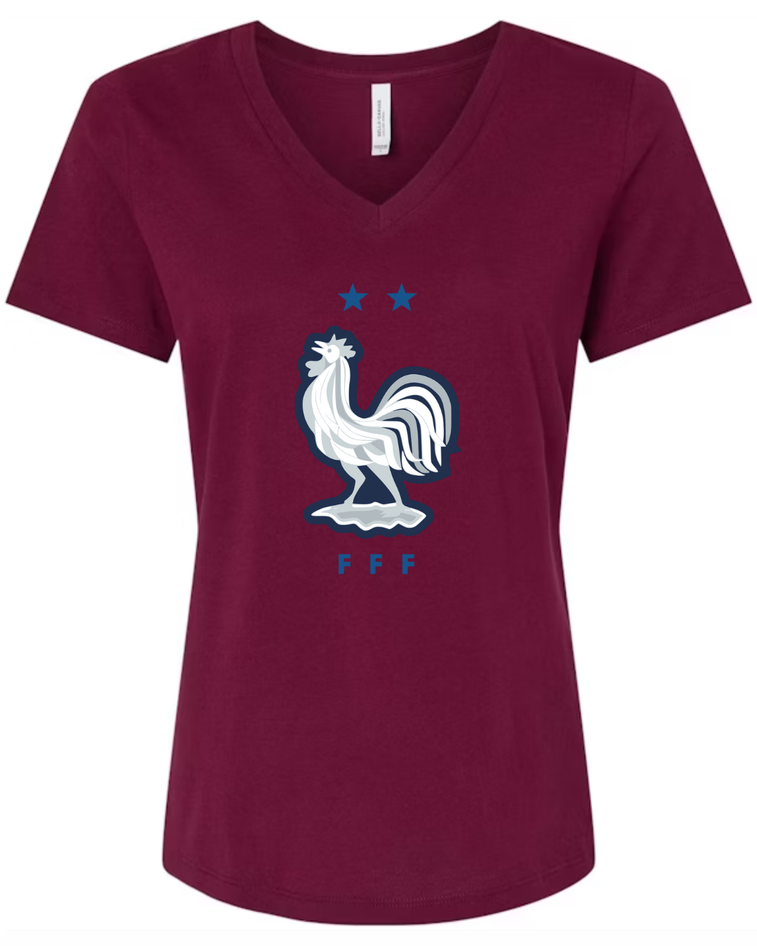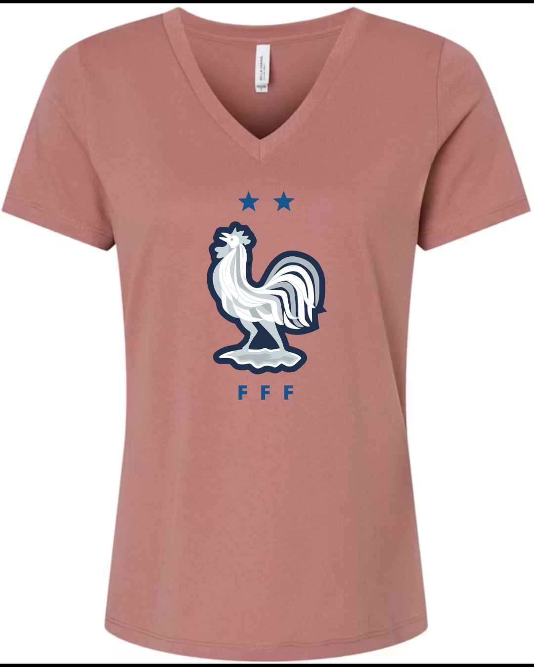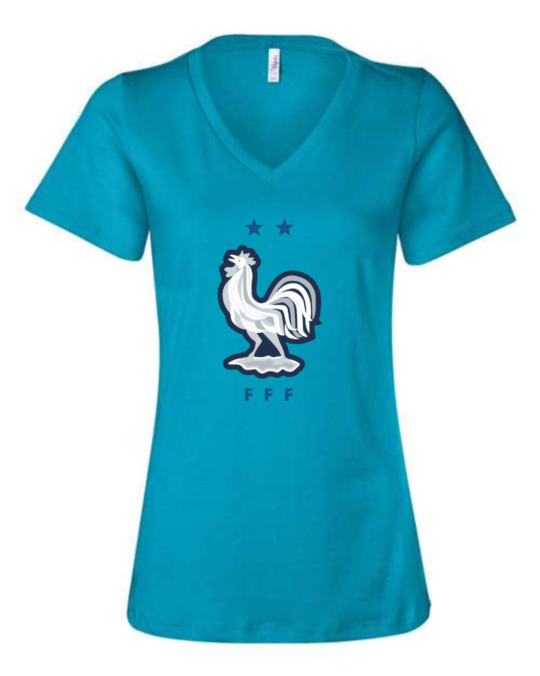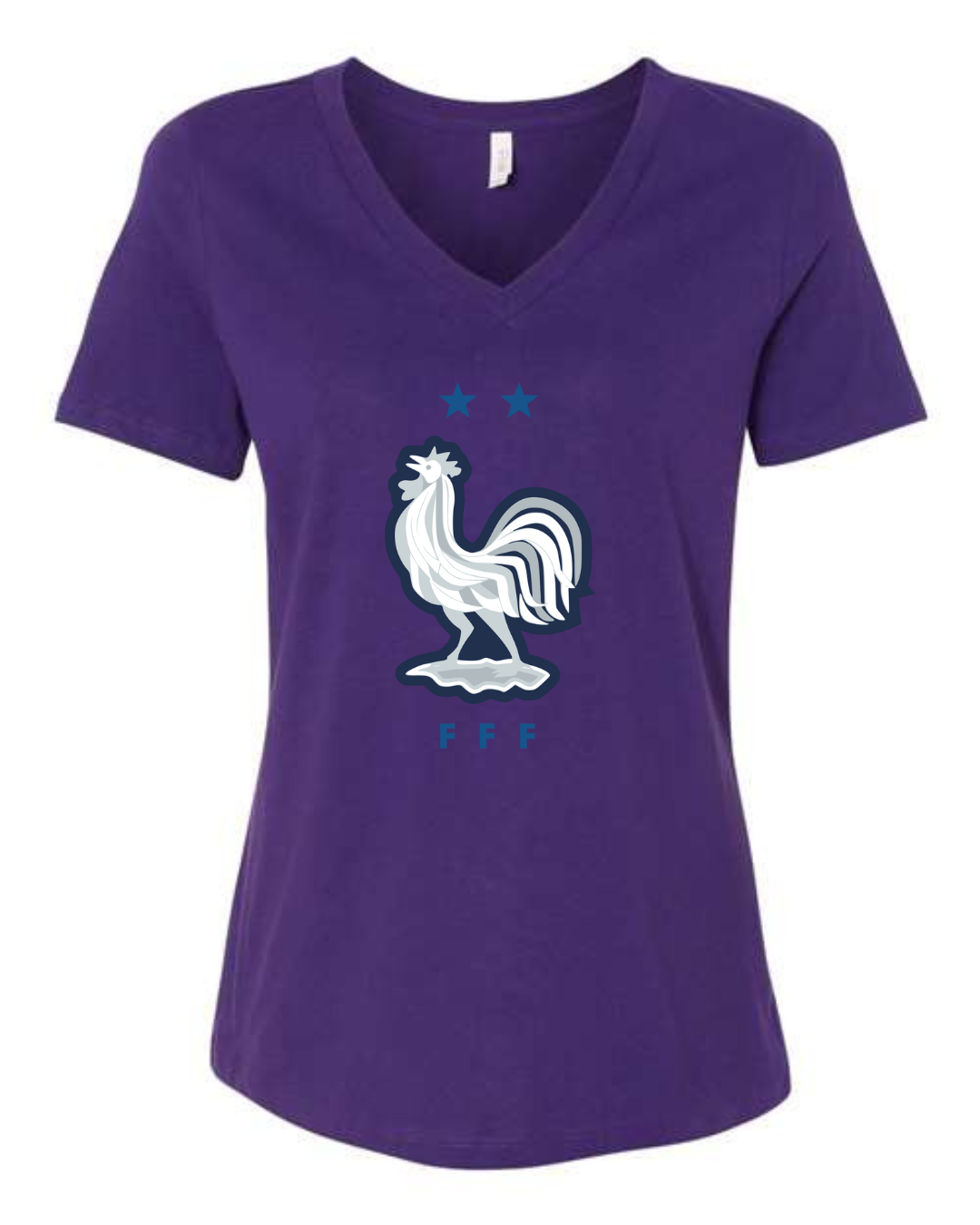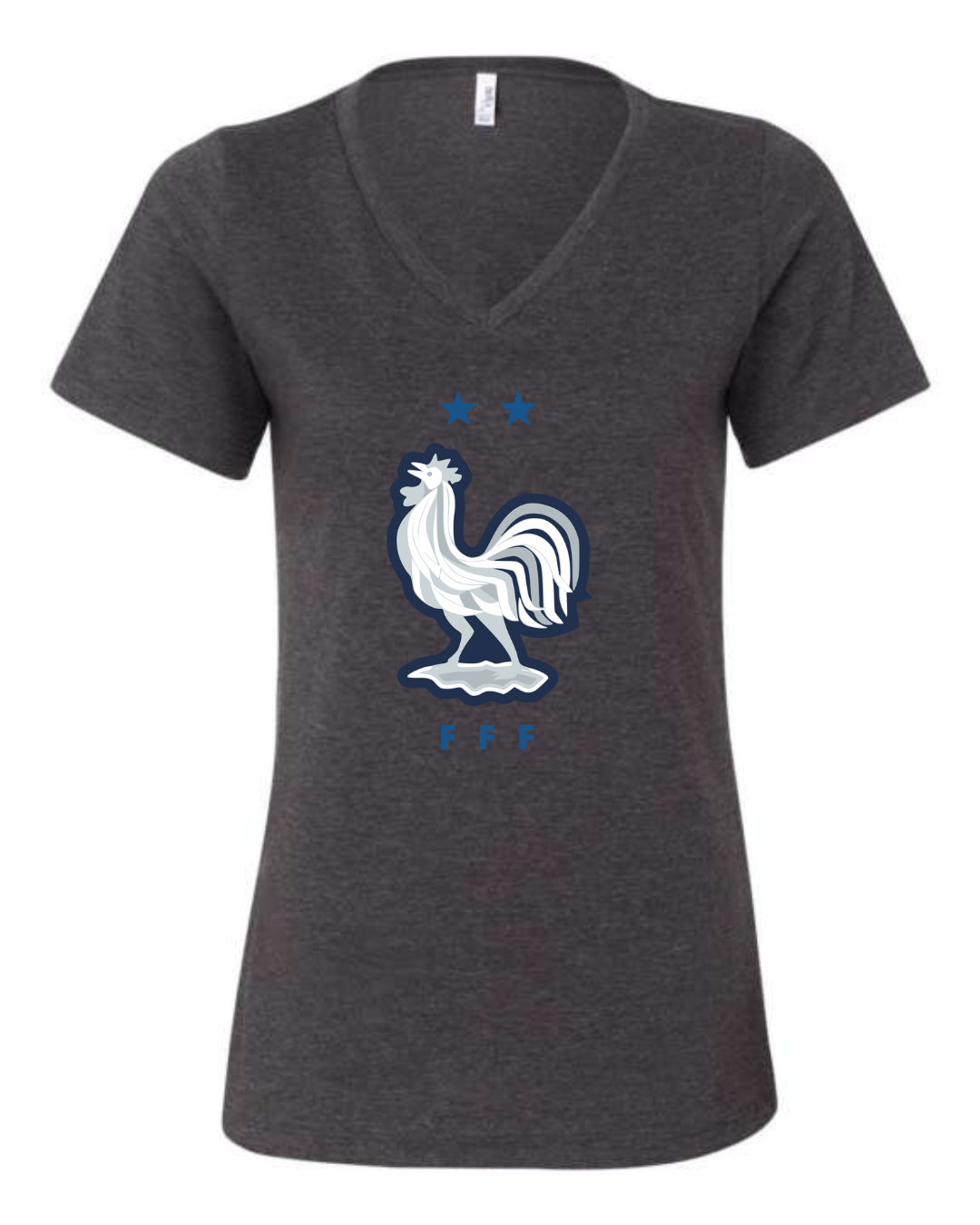 Inspired by the proud heritage of French football, this Bella Canvas Women’s V-Neck Tee features the iconic FFF rooster emblem in white and navy, accented by two stars symbolizing championship glory. Perfect for fans of Les Bleus and lovers of international football fashion, this tee blends national pride with modern style. Crafted from Bella Canvas’s ultra-soft cotton blend, it offers a flattering feminine fit and all-day comfort. Available in sizes S to 2XL.