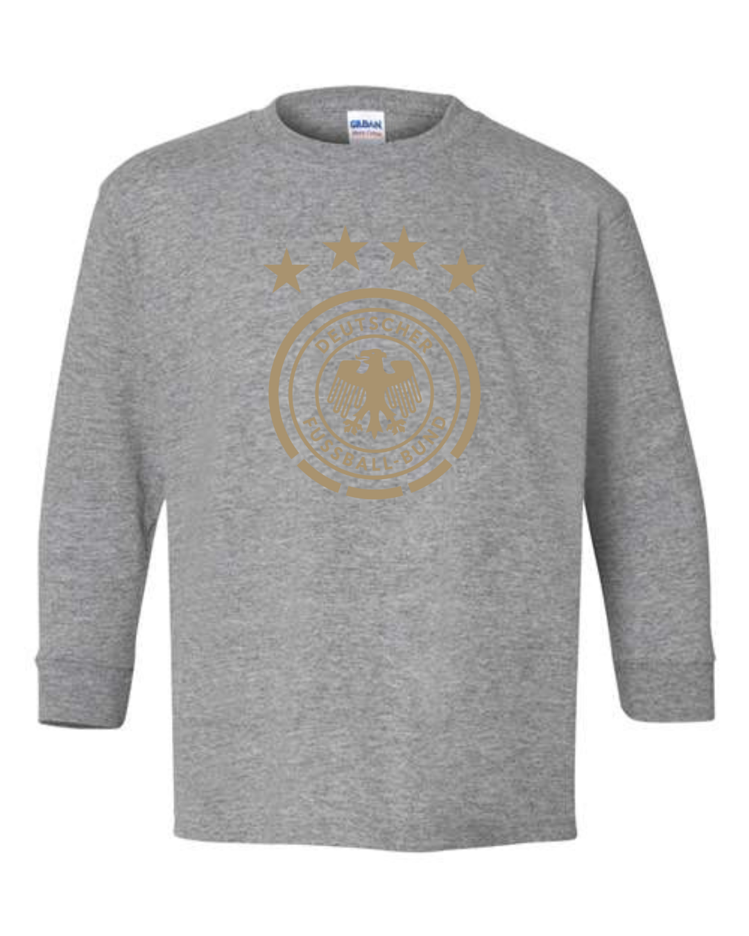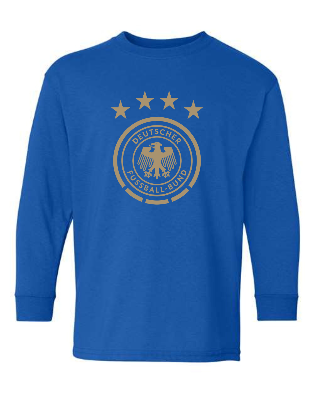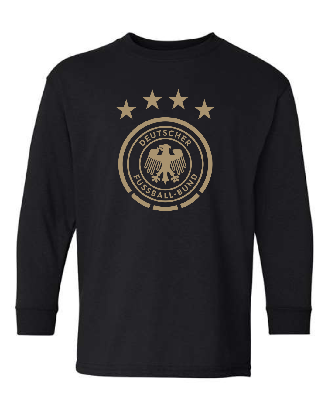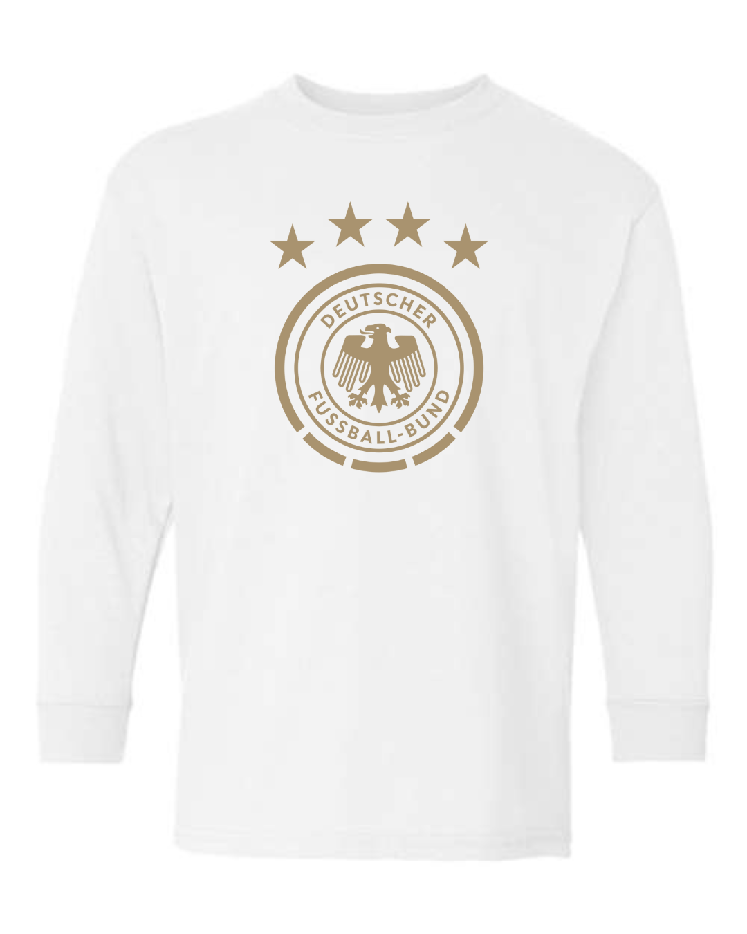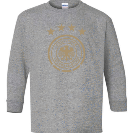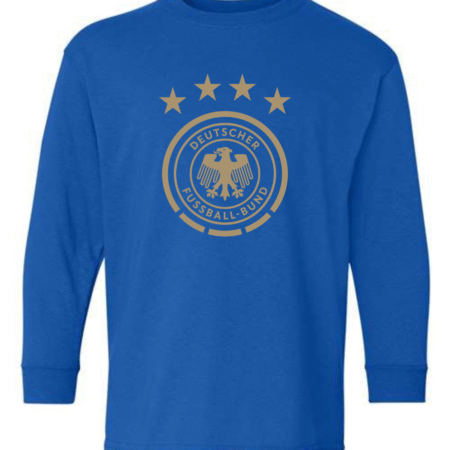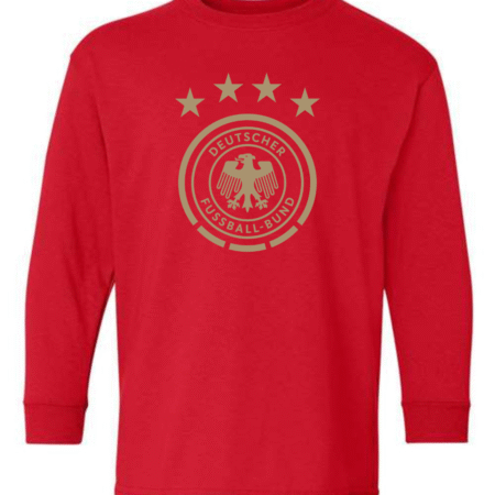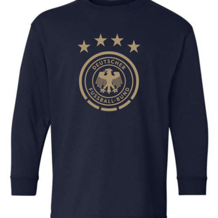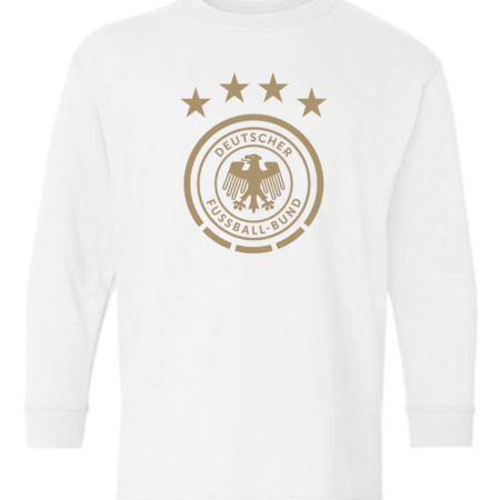 Show national pride with this Germany National Team Eagle Crest Youth Long Sleeve T-Shirt. Featuring the iconic Deutscher Fußball-Bund (DFB) eagle logo and four stars representing World Cup victories, this shirt is a must-have for young fans of Die Mannschaft. Crafted from a soft cotton-blend with ribbed cuffs, it offers both comfort and durability perfect for school, casual wear, or game day support.