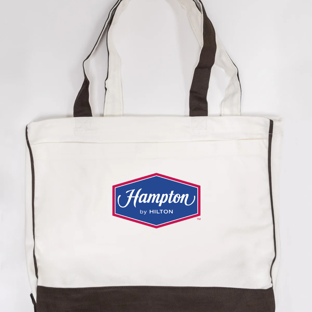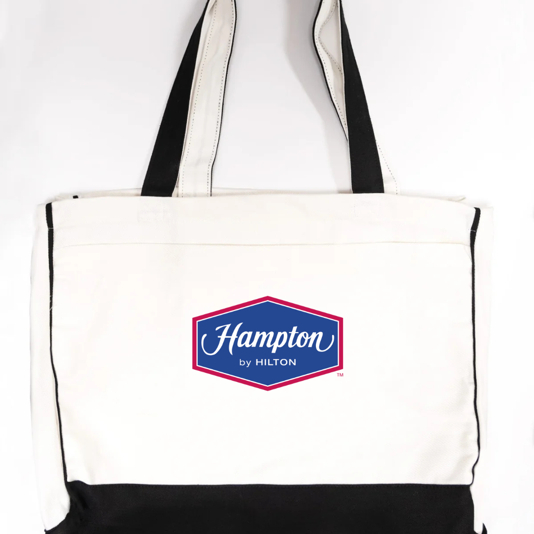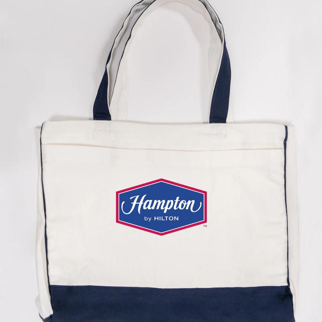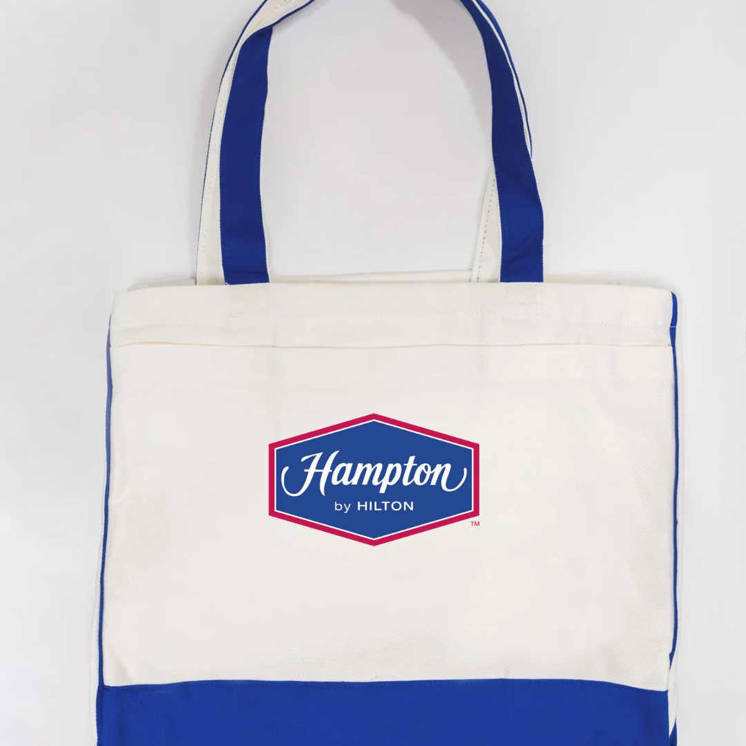 Travel in style with our Hampton by Hilton Logo Trimmed Tote Bag. Featuring the signature Hampton logo, this tote is perfect for guests, travelers, or anyone who loves carrying a touch of hotel-inspired comfort. Made with durable fabric and accented with neat blue trimming, it offers a roomy interior for everyday essentials, whether for trips, shopping, or casual use. Lightweight yet strong, this tote combines practicality with branded elegance.