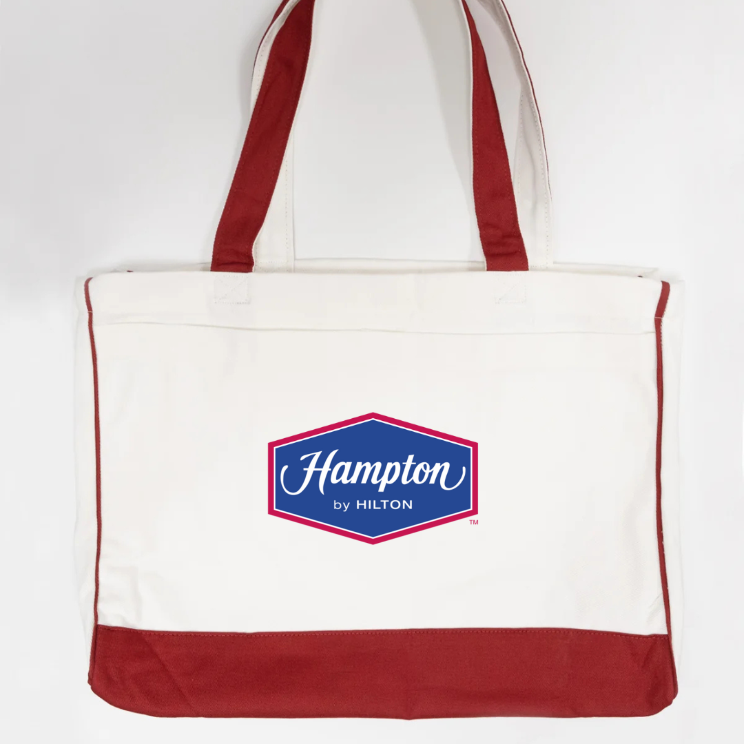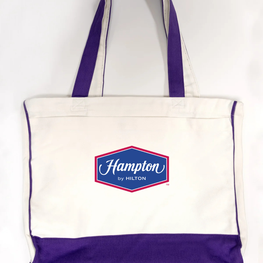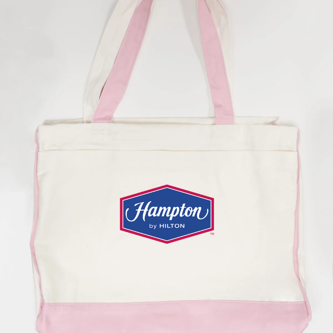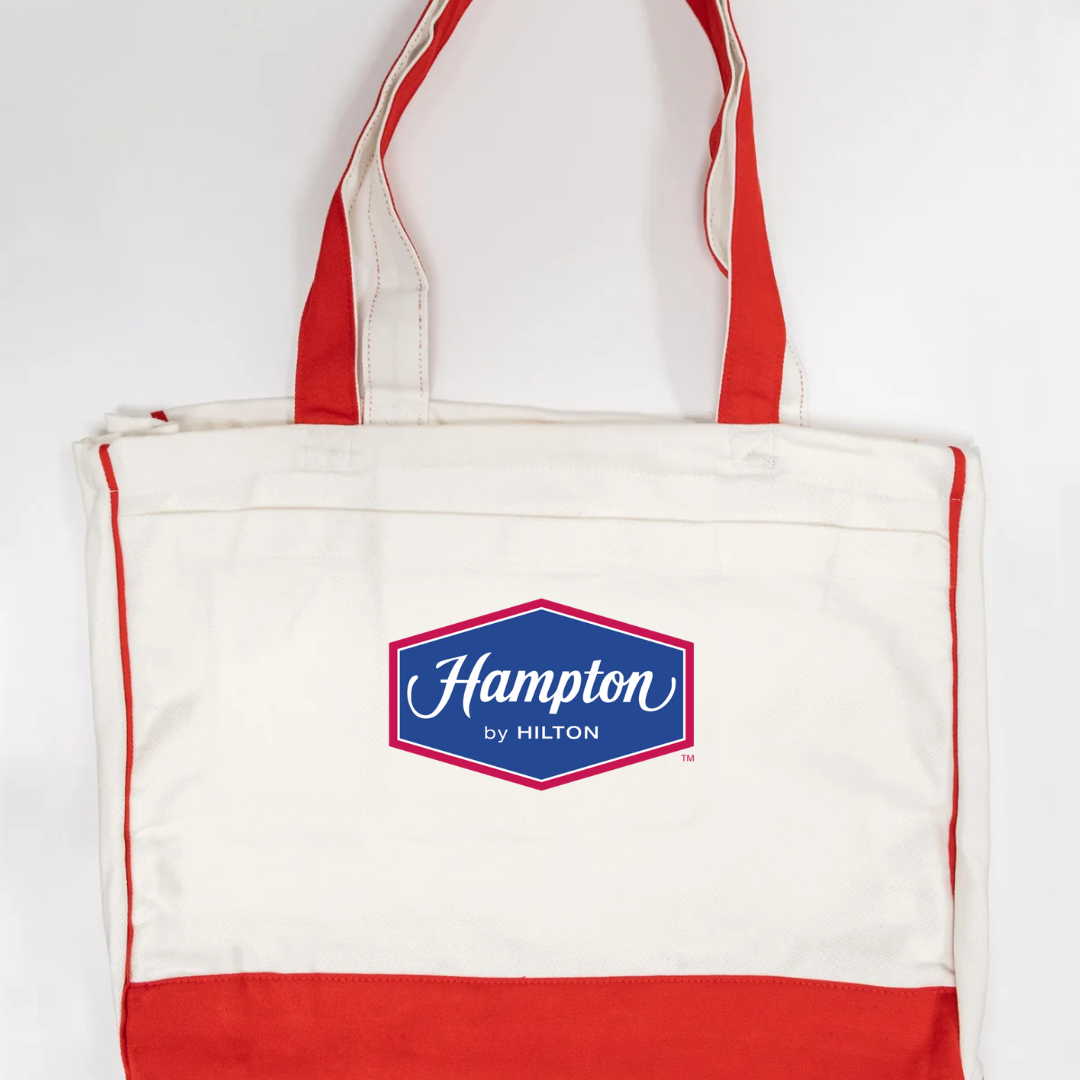 Travel in style with our Hampton by Hilton Logo Trimmed Tote Bag. Featuring the signature Hampton logo, this tote is perfect for guests, travelers, or anyone who loves carrying a touch of hotel-inspired comfort. Made with durable fabric and accented with neat blue trimming, it offers a roomy interior for everyday essentials, whether for trips, shopping, or casual use. Lightweight yet strong, this tote combines practicality with branded elegance.