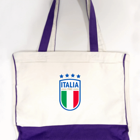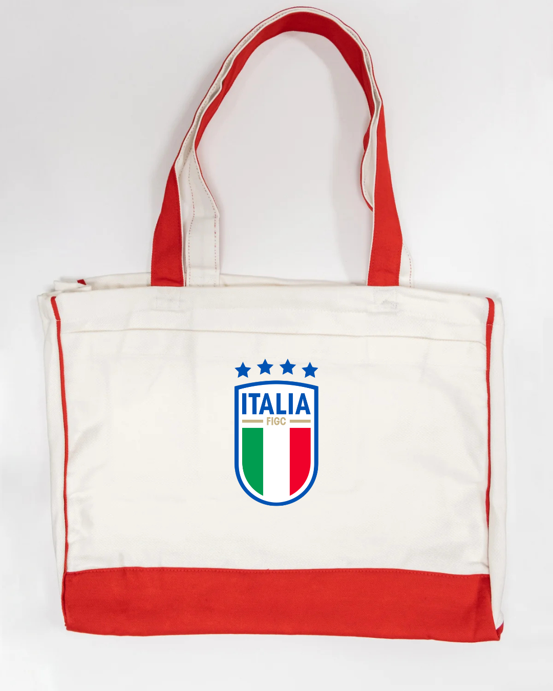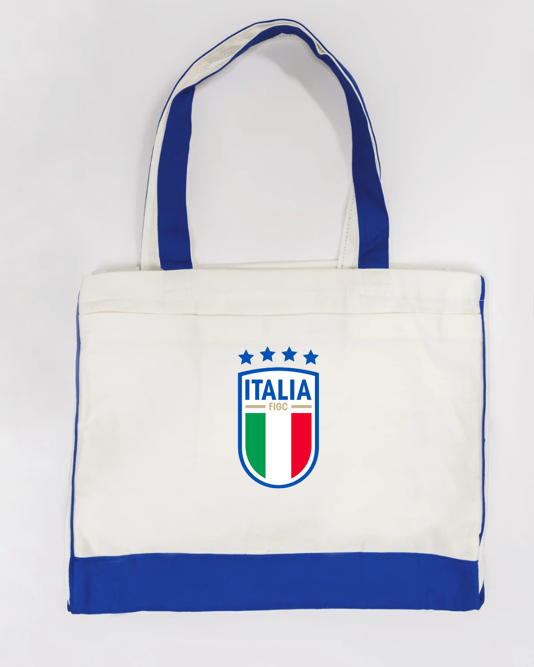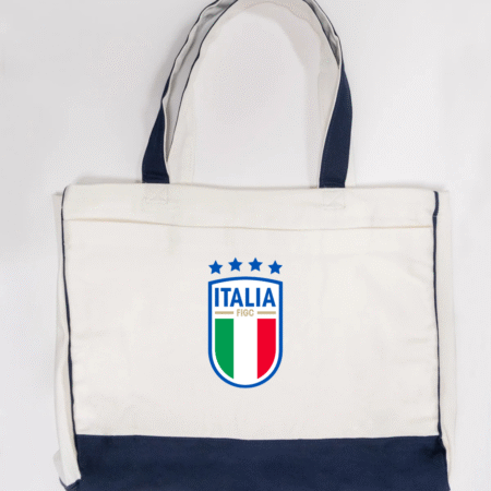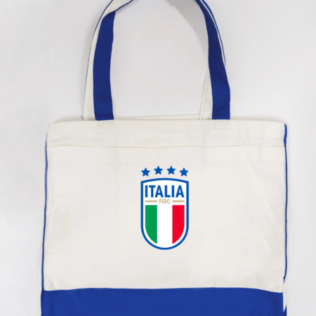 Show your love for Italian football with our Italia Football Logo Trimmed Tote Bag. Featuring the iconic Italy-inspired crest with stars and the tricolor shield, this tote blends national pride with everyday practicality. Crafted from durable canvas fabric and accented with dark brown trimming, it offers a spacious interior perfect for school, travel, errands, or match-day essentials. Lightweight, sturdy, and stylish—perfect for fans who want to carry team spirit everywhere they go.