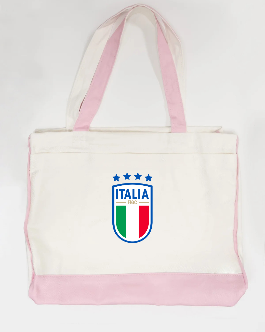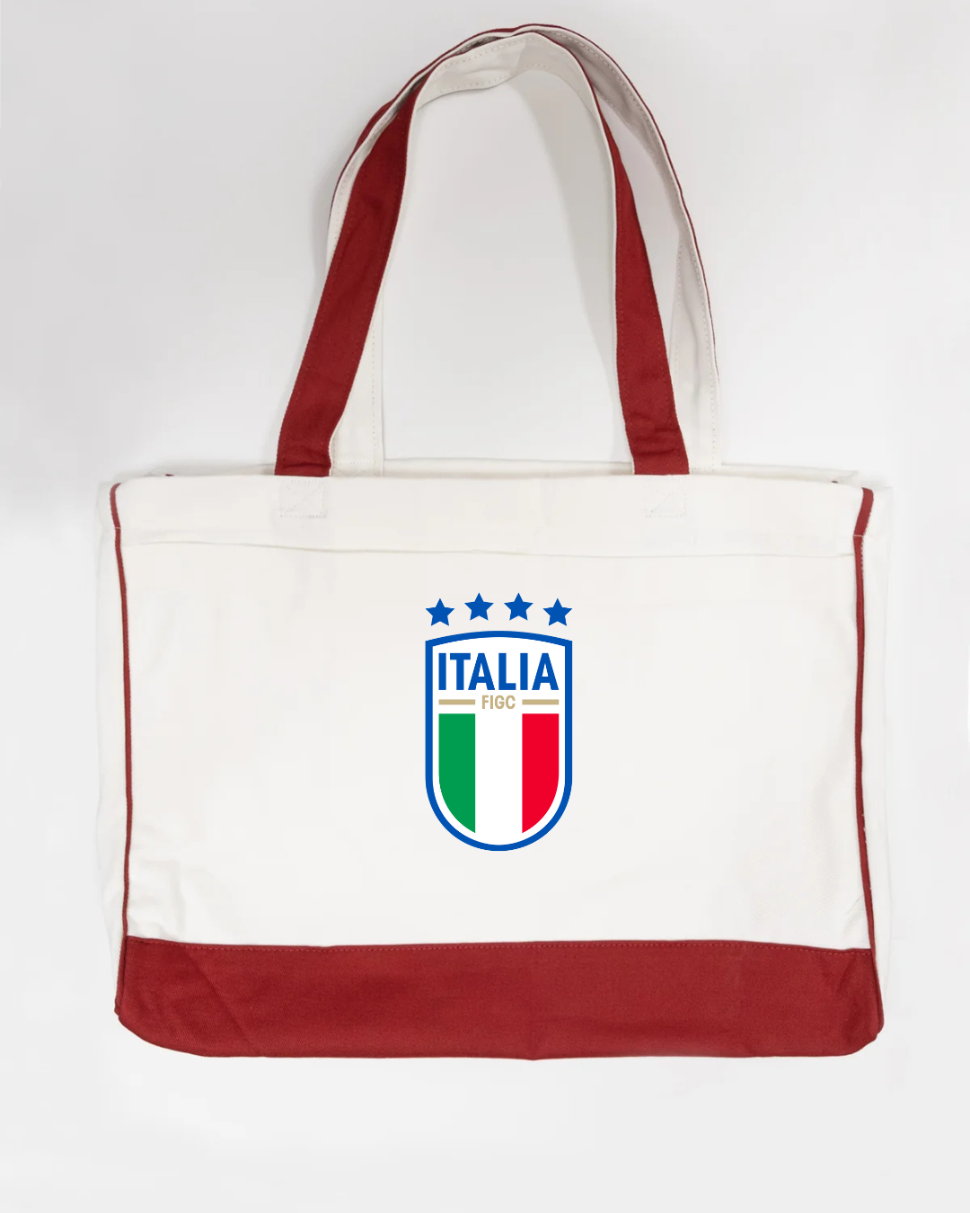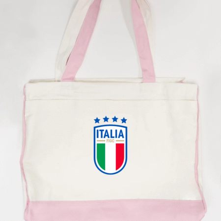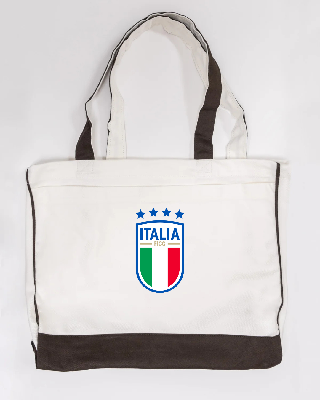 Show your love for Italian football with our Italia Football Logo Trimmed Tote Bag. Featuring the iconic Italy-inspired crest with stars and the tricolor shield, this tote blends national pride with everyday practicality. Crafted from durable canvas fabric and accented with dark brown trimming, it offers a spacious interior perfect for school, travel, errands, or match-day essentials. Lightweight, sturdy, and stylish—perfect for fans who want to carry team spirit everywhere they go.