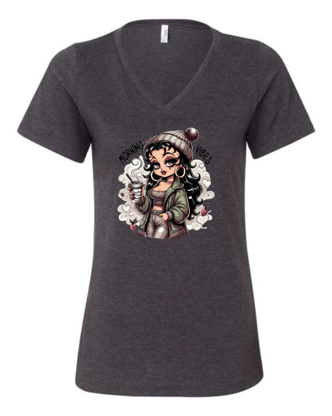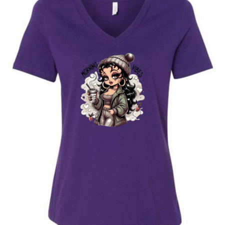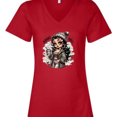 Inspired by cozy mornings and laid-back coffee culture, this Bella Canvas Women’s V-Neck Tee features an adorable cartoon girl in a beanie holding her favorite drink with “Morning Vibes” text above. The playful artwork, combined with soft muted colors, makes it perfect for casual outings, coffee lovers, and fans of cute graphic tees. Crafted from Bella Canvas’s ultra-soft cotton blend with a flattering feminine cut for everyday comfort. Available in sizes S to 2XL.
