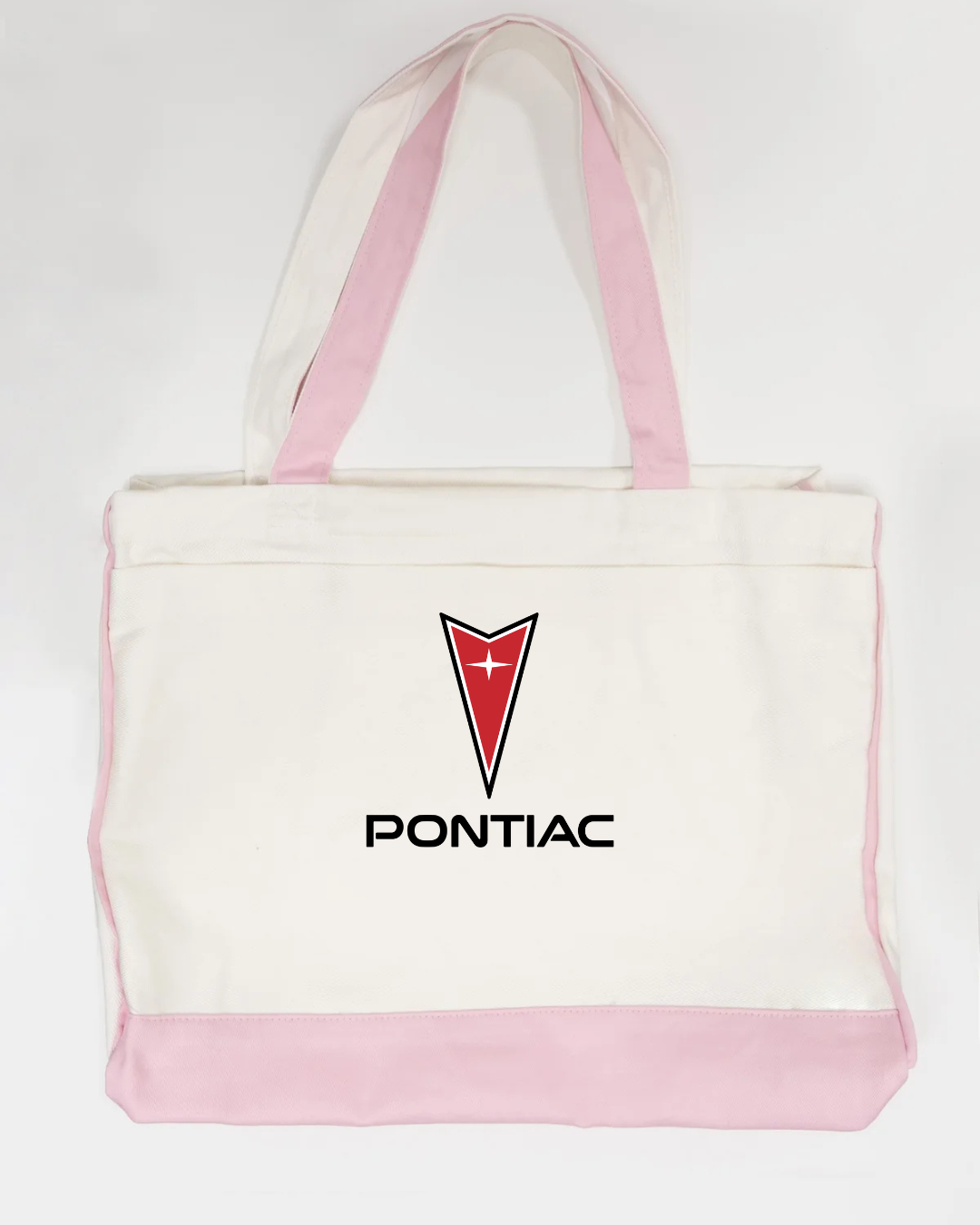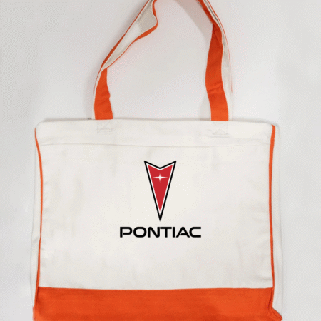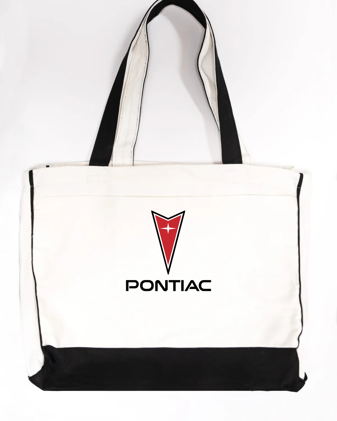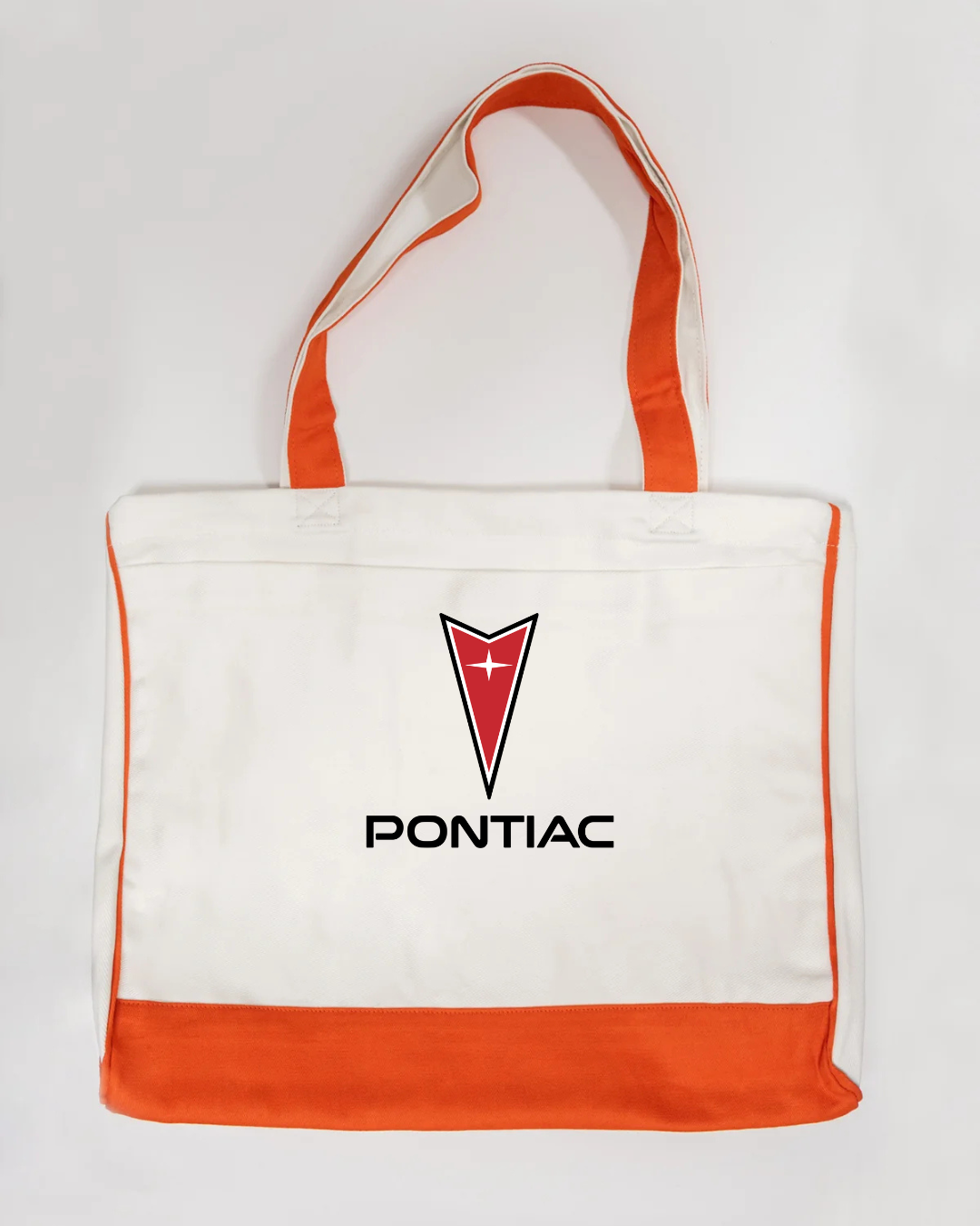 Show off classic automotive heritage with our Pontiac Logo Trimmed Tote Bag. Featuring the iconic Pontiac arrowhead logo, this tote blends vintage muscle-car style with everyday practicality. Crafted from durable canvas fabric and accented with sleek black trimming, it offers a spacious interior perfect for errands, work, travel, or daily essentials. Lightweight, sturdy, and stylish—ideal for fans of classic American car culture.