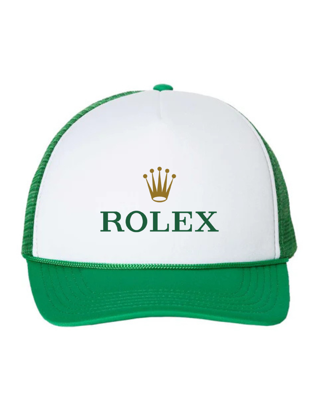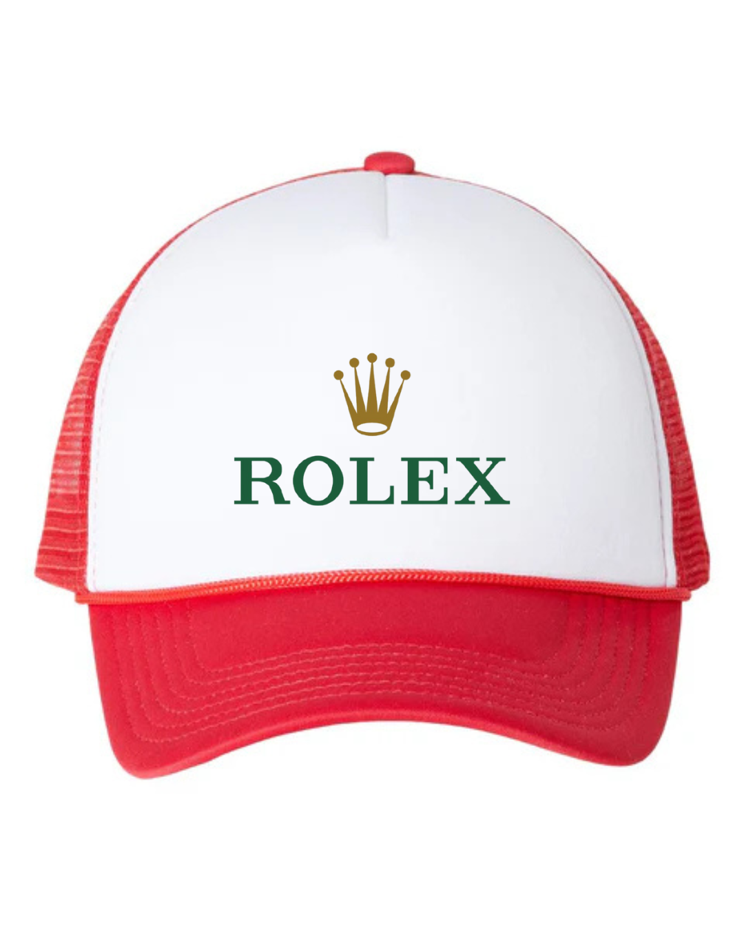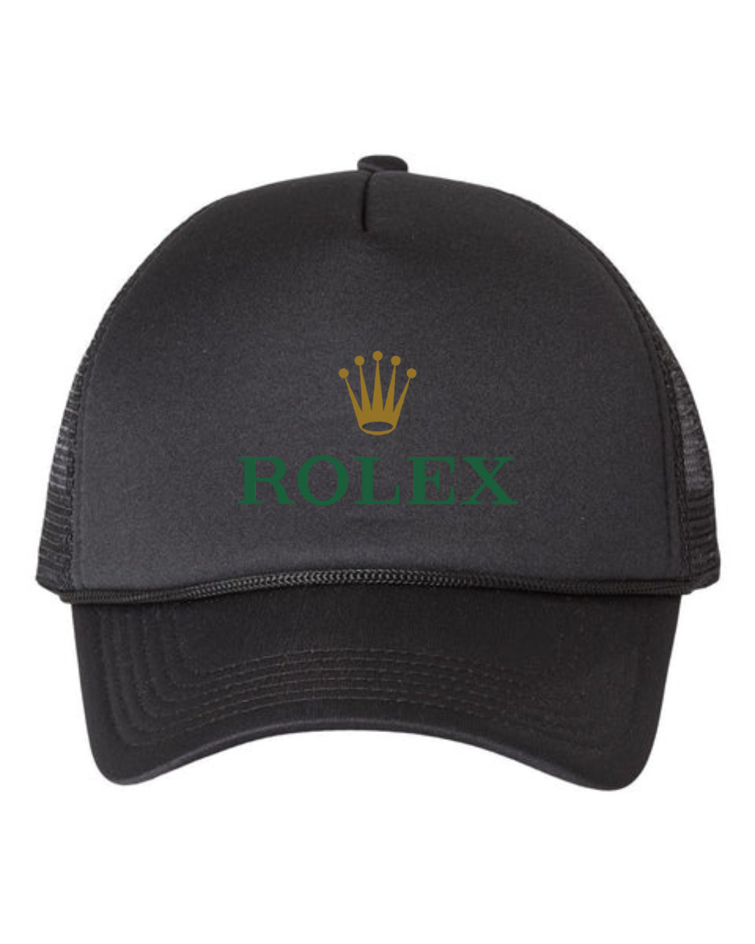 Add a touch of luxury style to your everyday look with our Rolex Logo Trucker Cap. Featuring the iconic crown emblem and text on the structured front panel, this cap blends sophistication with casual comfort. The breathable mesh back keeps you cool, while the adjustable snap closure ensures a secure and comfortable fit — perfect for collectors, watch enthusiasts, or anyone who appreciates refined branding.
