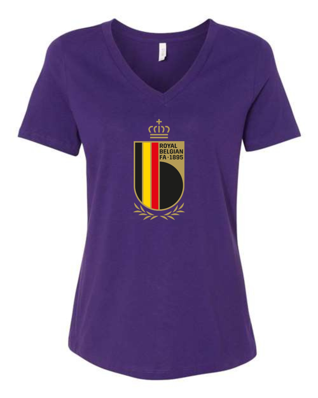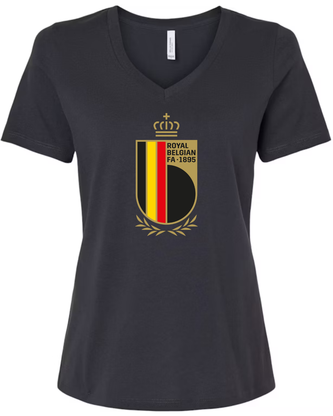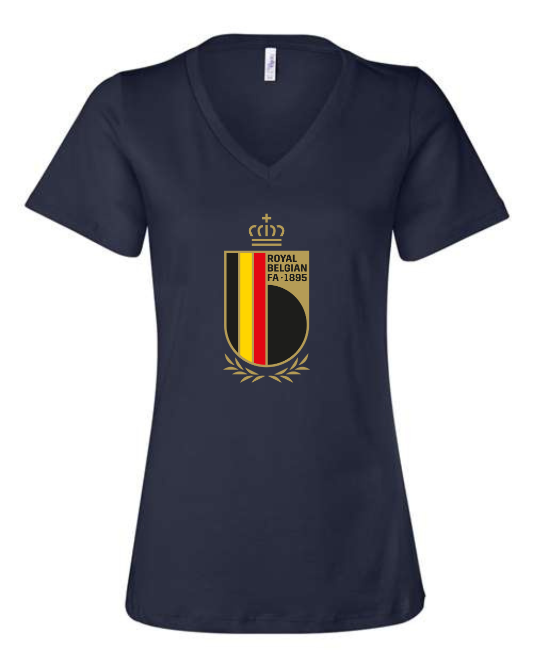 Inspired by the proud football legacy of Belgium, this Bella Canvas Women’s V-Neck Tee features the elegant black, red, and yellow crest of the Royal Belgian Football Association, complete with crown and laurel accents. Perfect for supporters of the Belgian national team and lovers of European football, this tee blends classic heritage with a flattering modern fit. Crafted from Bella Canvas’s ultra-soft cotton blend for all-day comfort. Available in sizes S to 2XL.