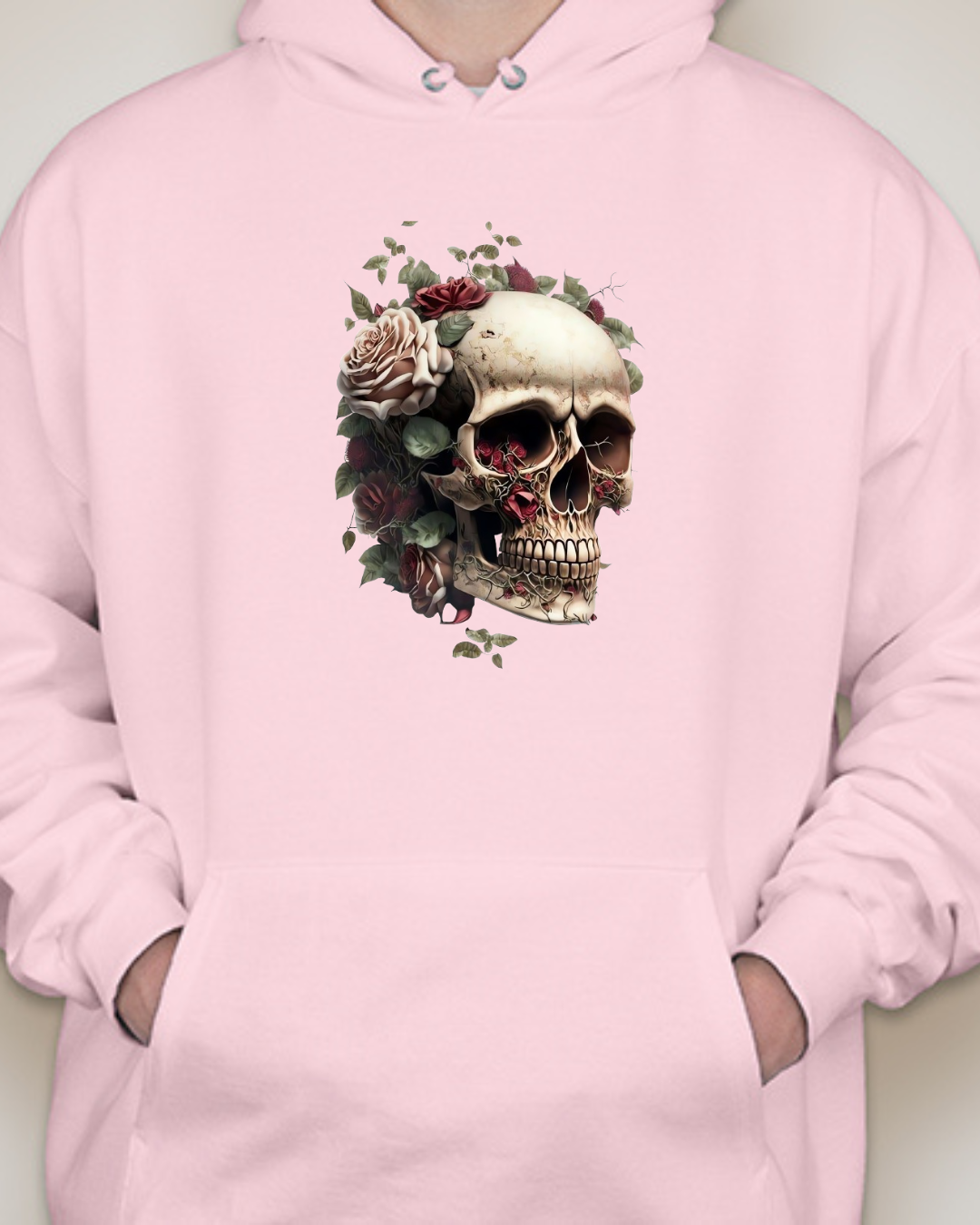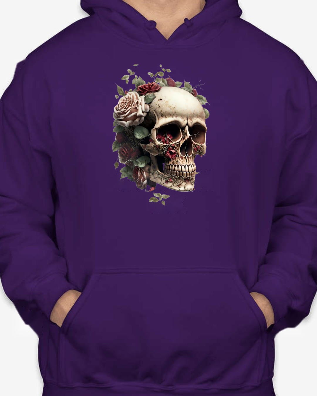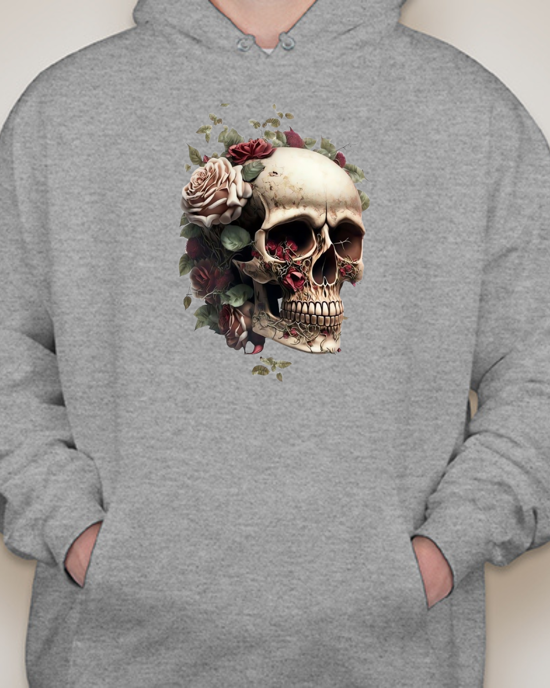 Dark meets delicate. This Skull & Roses Botanical Unisex Pullover Hoodie pairs a detailed skull with blooming roses and greenery for a moody, art-forward look. Cozy enough for everyday wear and bold enough to stand out—printed with crisp, long-lasting detail on soft Gildan fleece. Available in sizes S to 2XL.