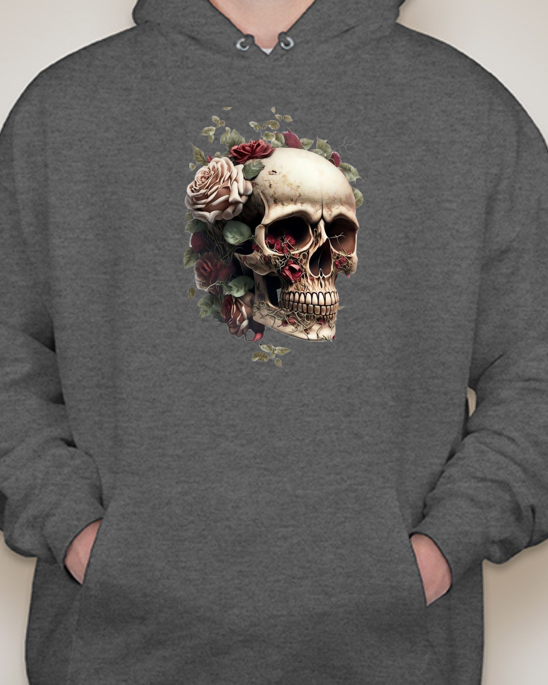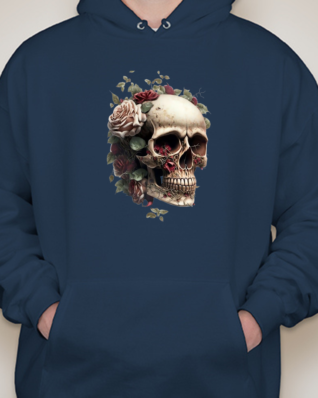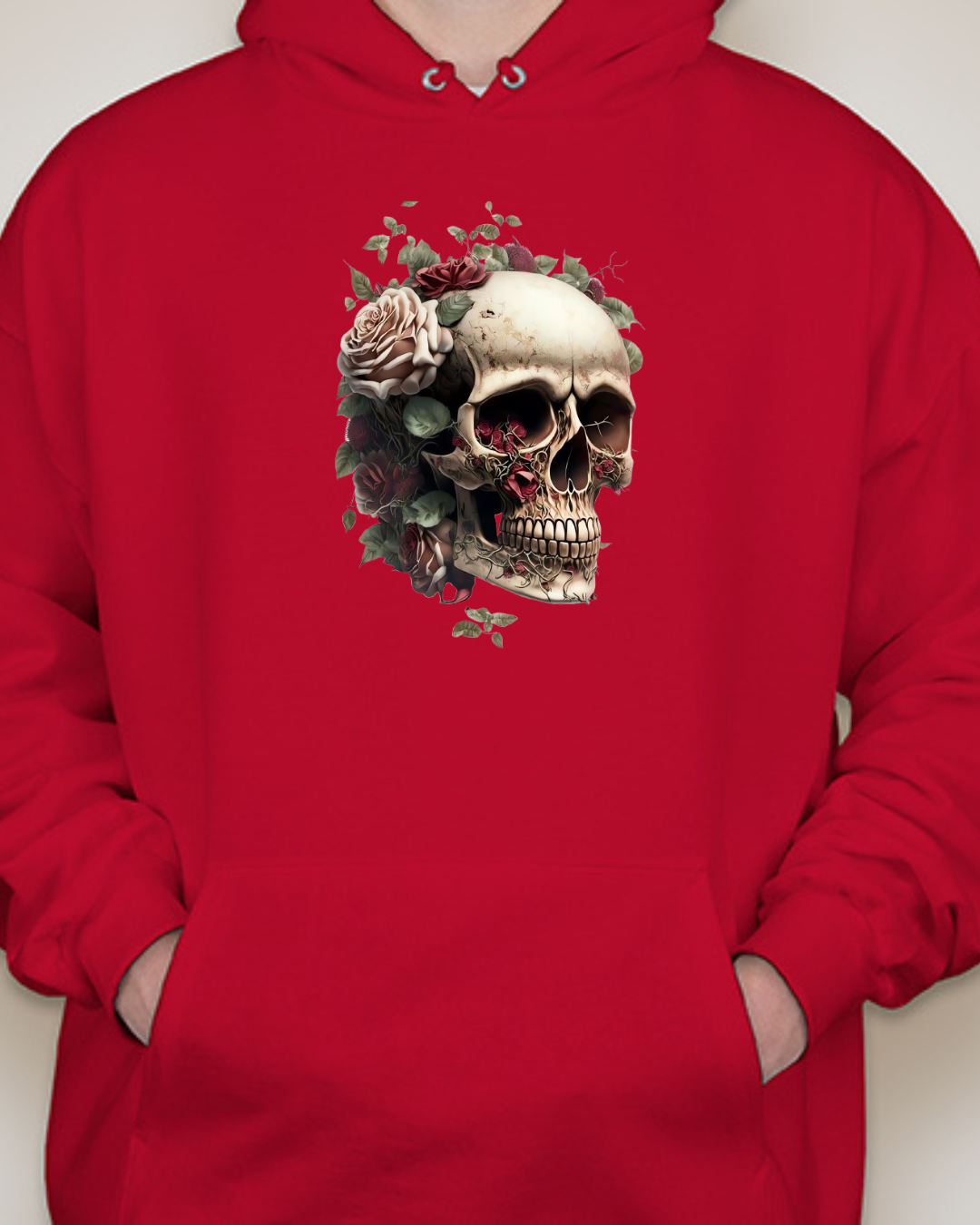 Dark meets delicate. This Skull & Roses Botanical Unisex Pullover Hoodie pairs a detailed skull with blooming roses and greenery for a moody, art-forward look. Cozy enough for everyday wear and bold enough to stand out—printed with crisp, long-lasting detail on soft Gildan fleece. Available in sizes S to 2XL.