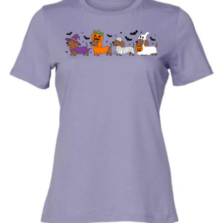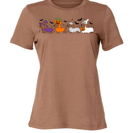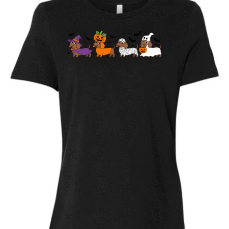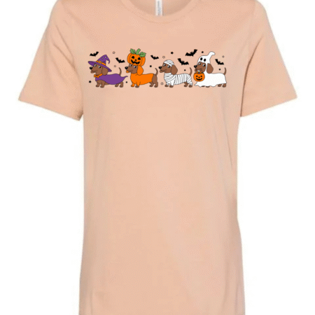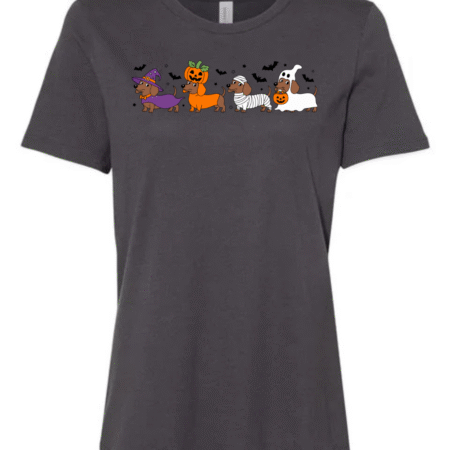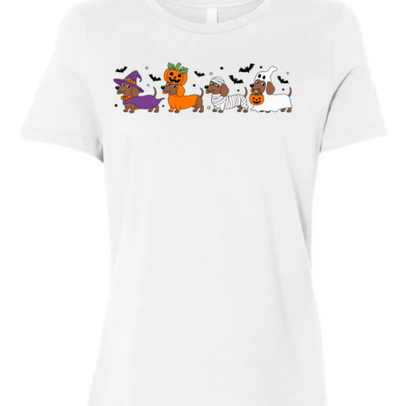 Celebrate spooky season with a side of adorable! This fun Halloween t-shirt features a lineup of festive wiener dogs dressed as a witch, pumpkin, mummy, and ghost — surrounded by flying bats and Halloween charm. Perfect for dachshund lovers and Halloween party goers, this Bella Canvas women’s crewneck tee combines playful design with premium softness and comfort.