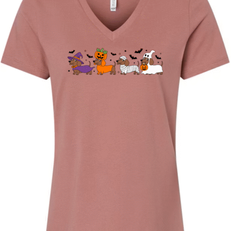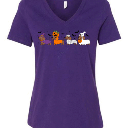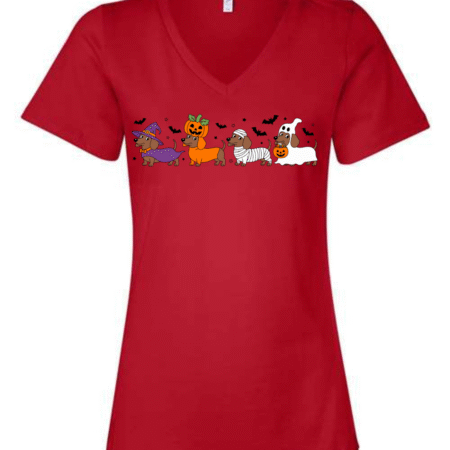Get your spooky on with this adorable Wiener Dog Halloween Party Bella Canvas Women’s V-Neck Tee! Featuring a line-up of dachshunds dressed as a witch, pumpkin, mummy, and ghost, this playful design is perfect for Halloween lovers and dog moms alike. Soft, comfy, and full of festive charm — ideal for trick-or-treating, fall events, or lounging with your pup!