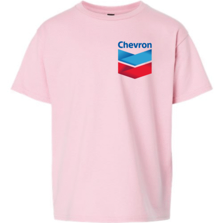 Fuel up their look with this Youth Chevron Logo T-Shirt, featuring the bold red and blue Chevron emblem on a soft pastel pink background. This retro-inspired design combines comfort with iconic branding perfect for young fans of vintage style, road culture, or classic American brands.