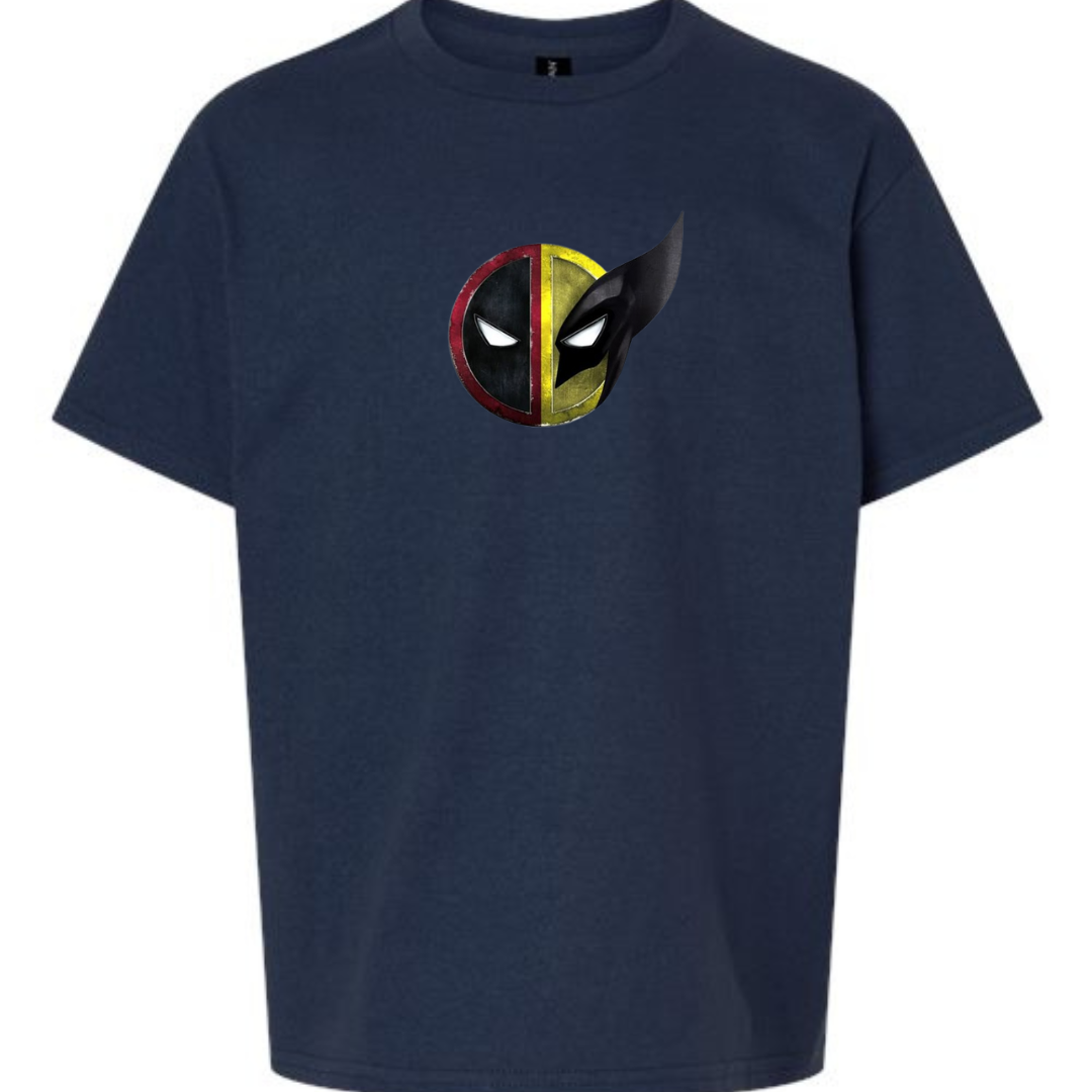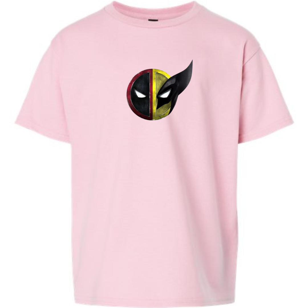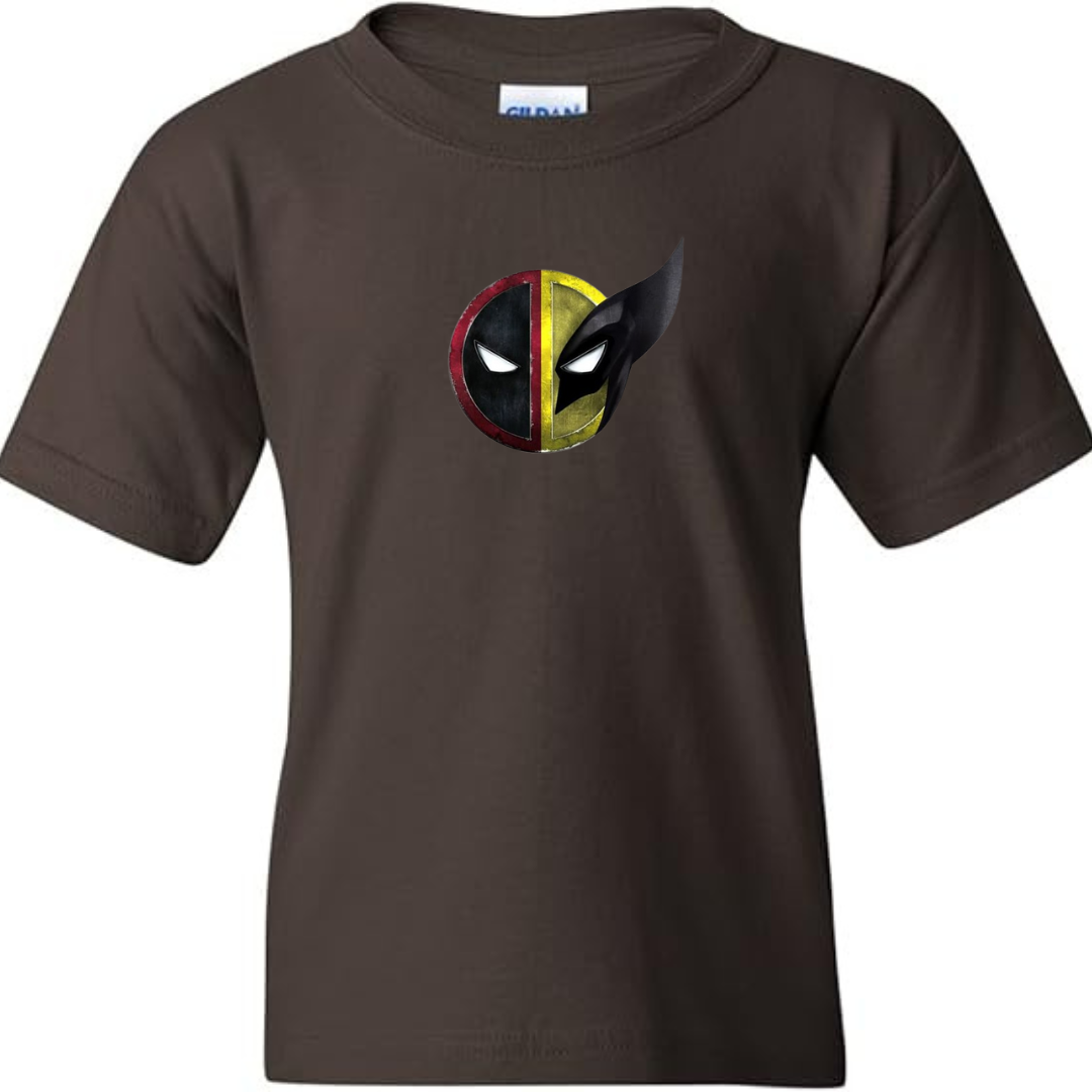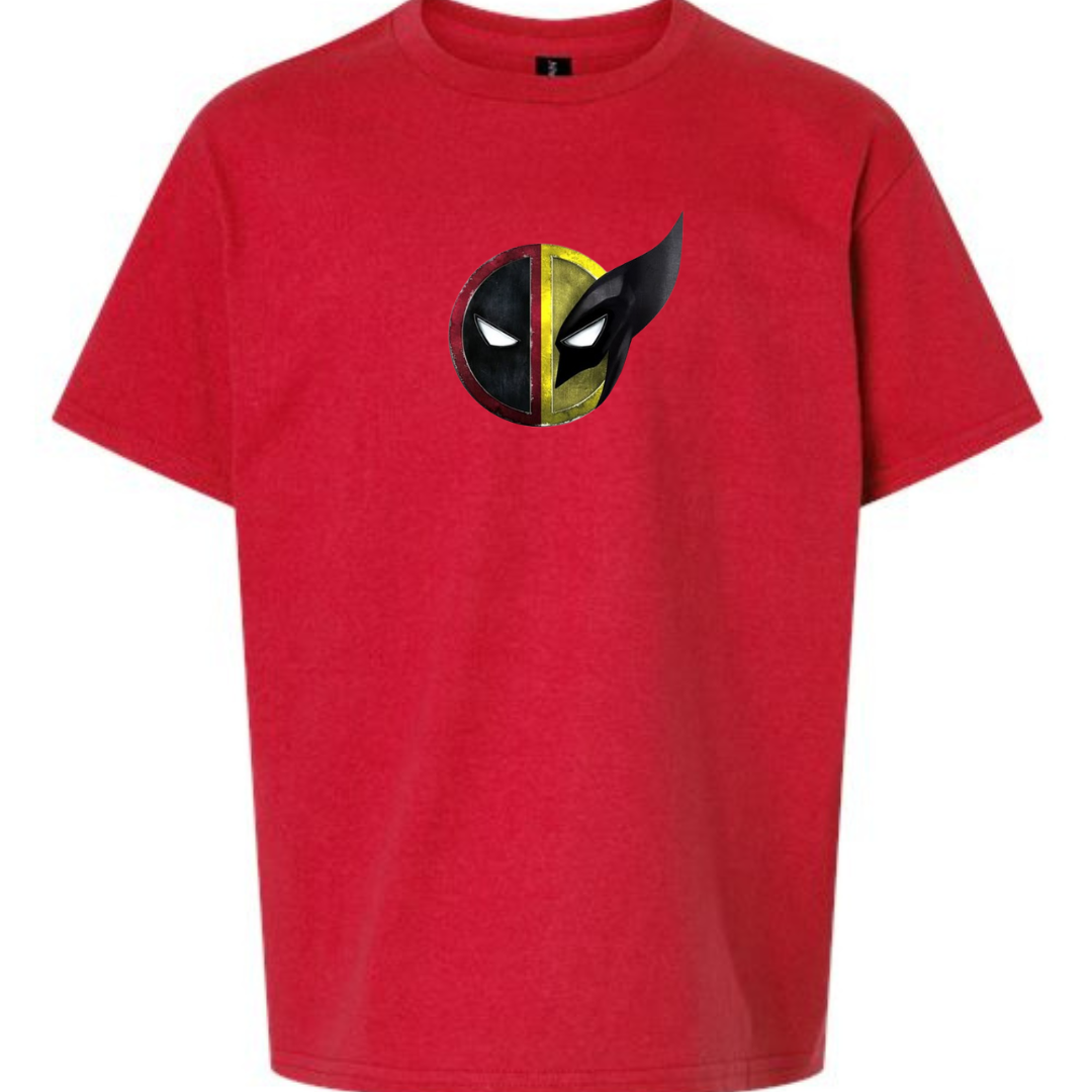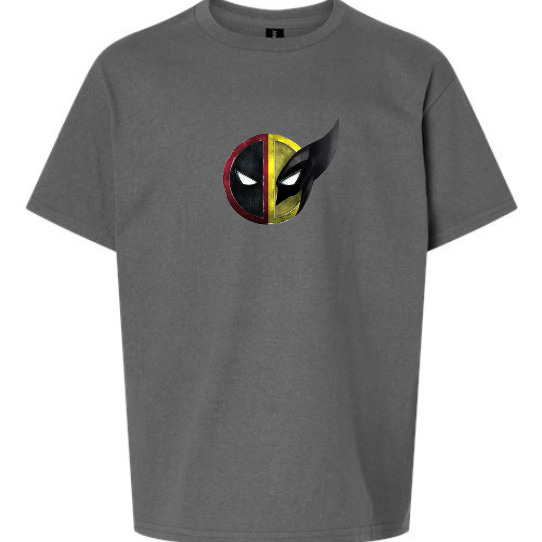 Unleash dual hero energy with this Youth Deadpool & Wolverine Mask Mashup T-Shirt! Featuring a bold split-face graphic inspired by two of the most iconic Marvel antiheroes, this tee is perfect for young comic fans who love action, attitude, and a touch of chaos.