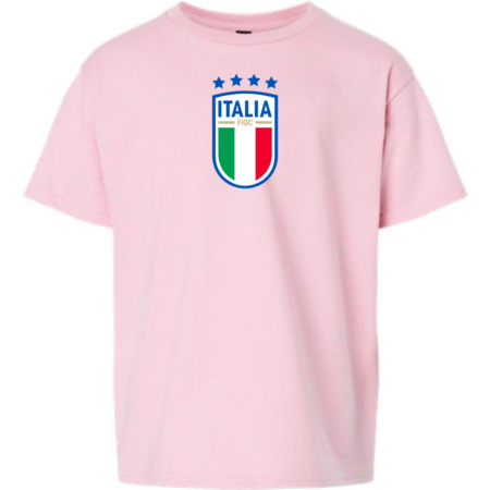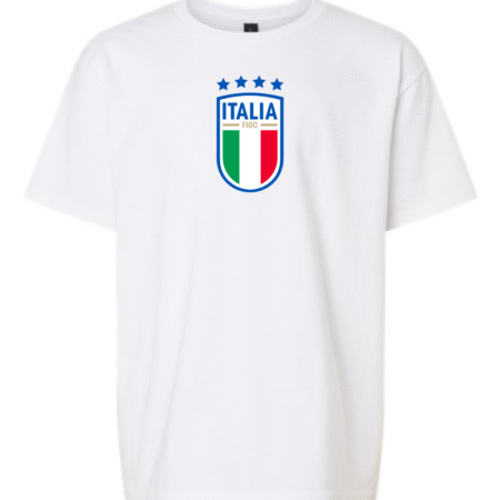 Forza Azzurri! Show your love for Italy with this Youth Italy National Football Logo T-Shirt. Featuring the classic crest with the tricolor shield and four stars celebrating their World Cup victories, this tee is perfect for young fans cheering on the Italian squad in style.