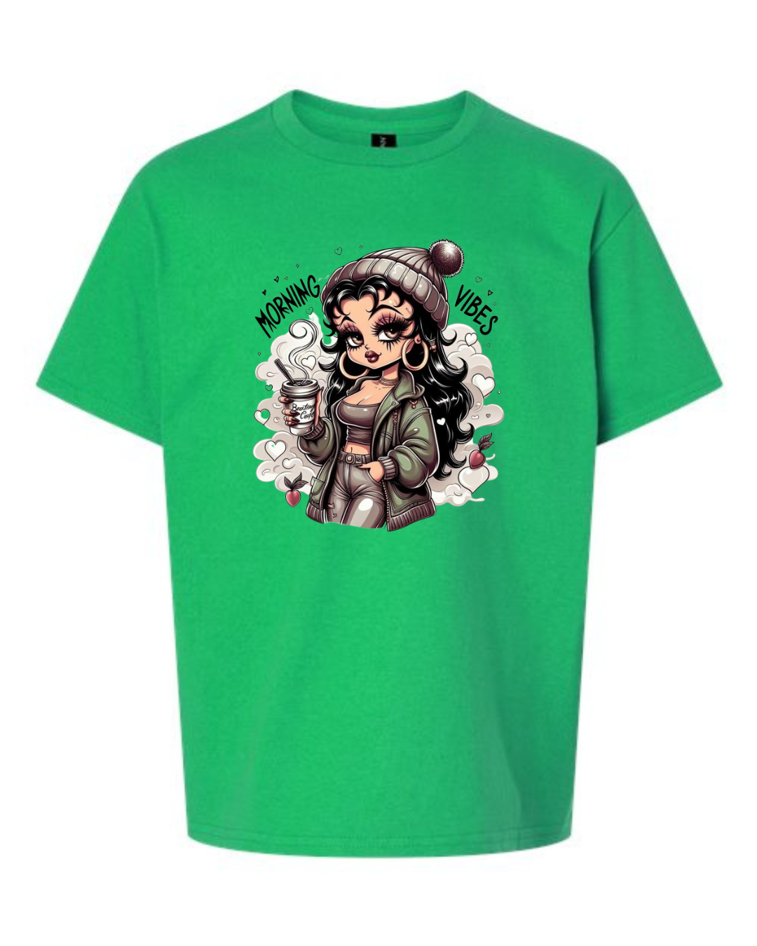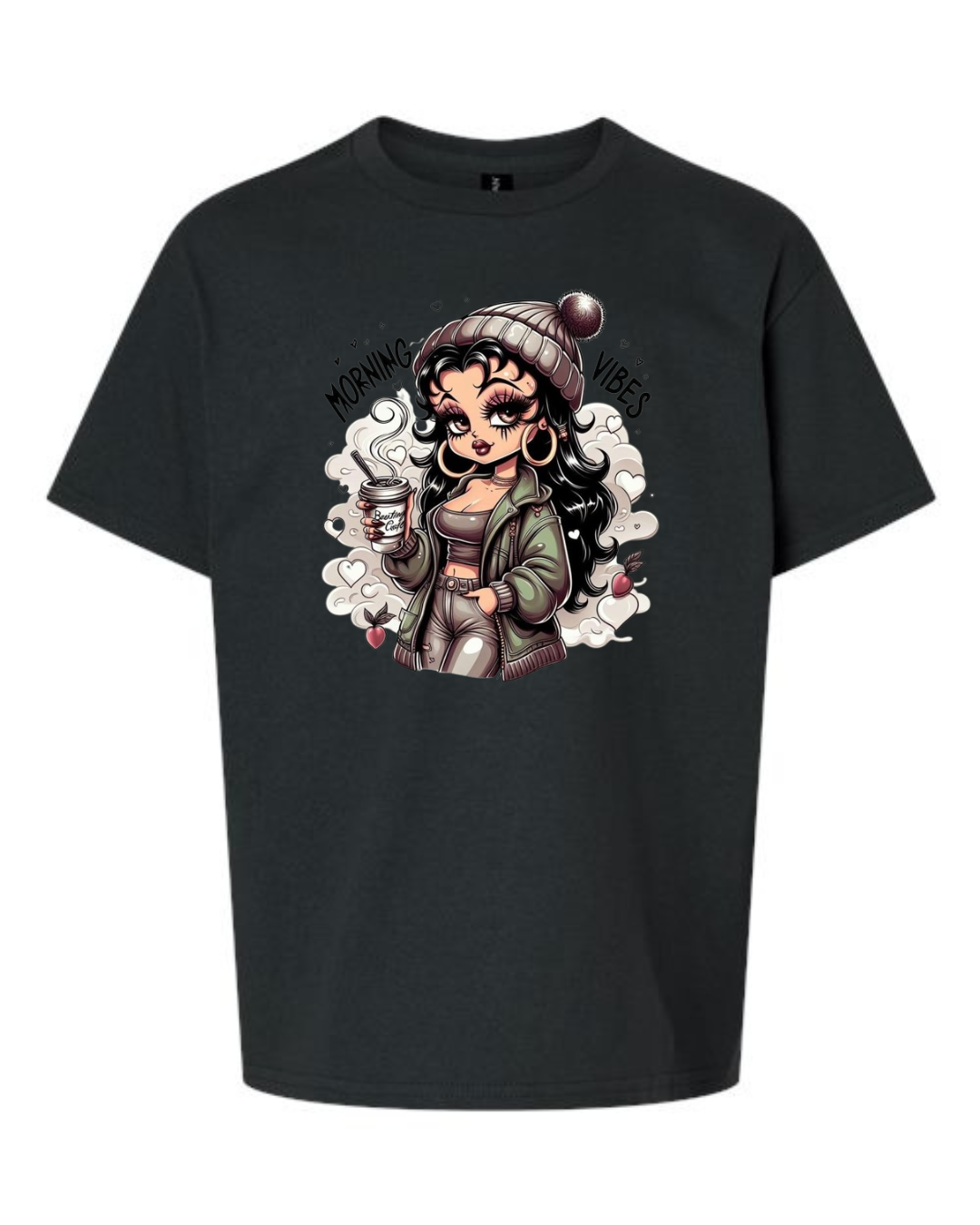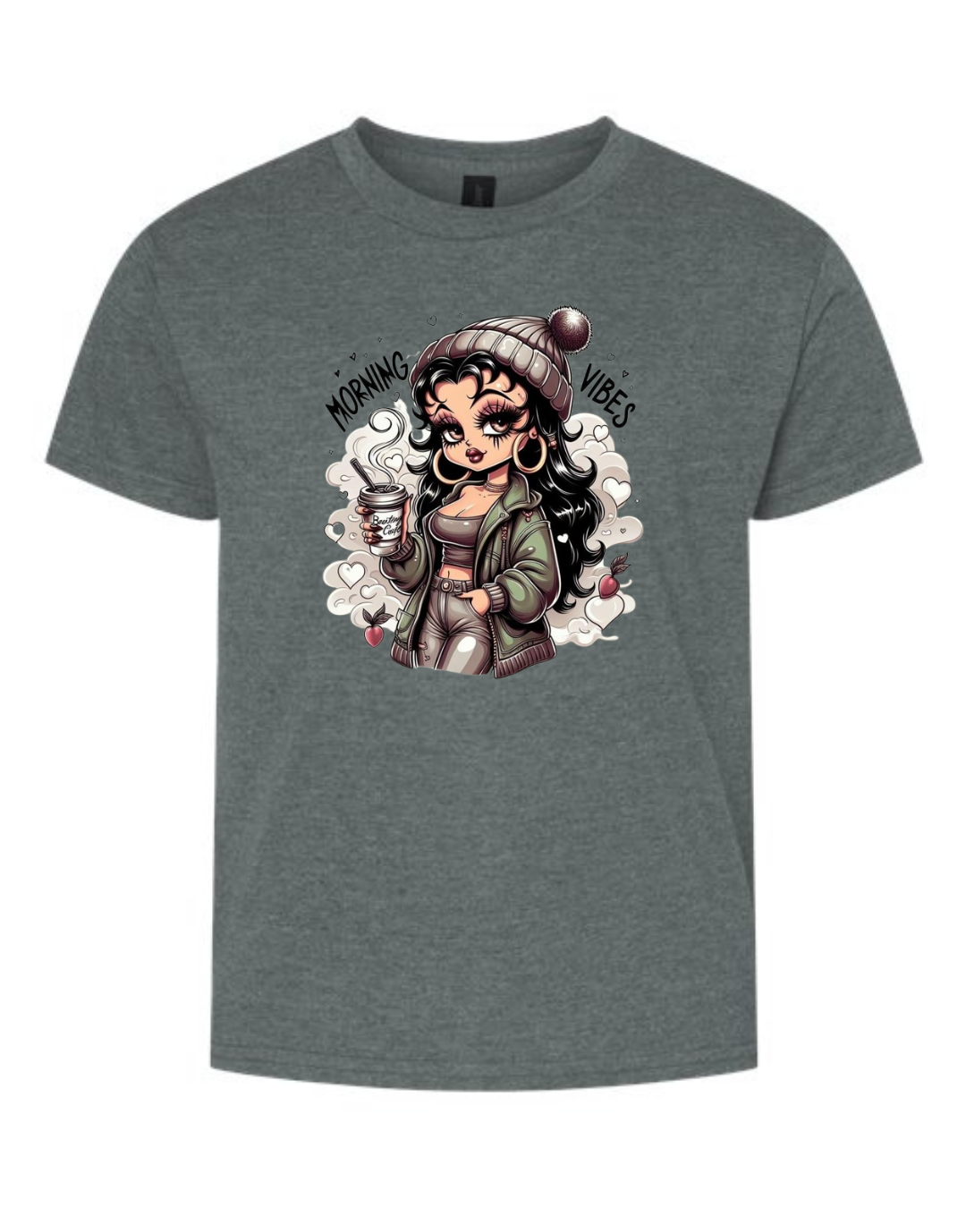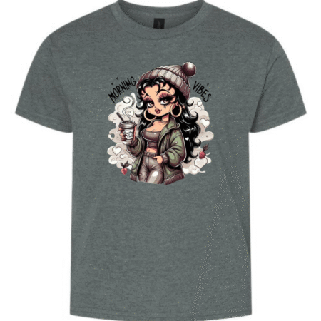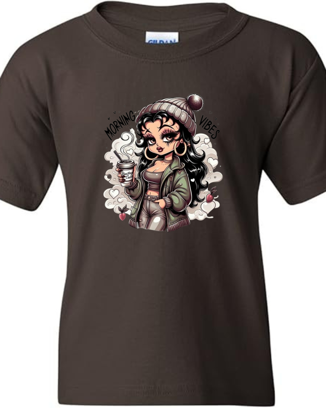 Start their day in style with this Youth Morning Vibes Graphic T-Shirt. Featuring a cozy cartoon character sipping coffee in a beanie and jacket, surrounded by whimsical steam art, this tee is perfect for kids who love cute, trendy, and cozy aesthetics. Soft, fun, and effortlessly cool.
