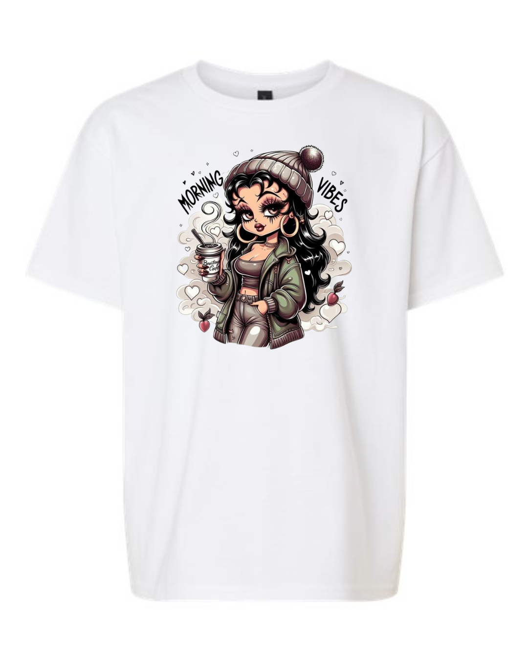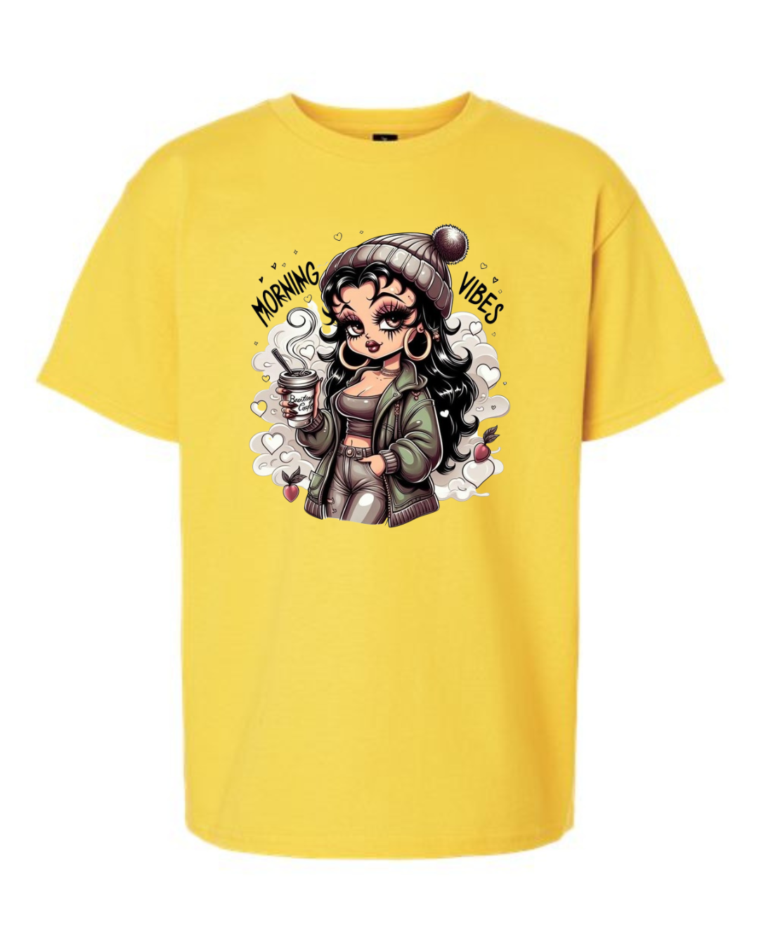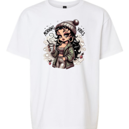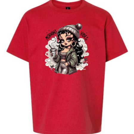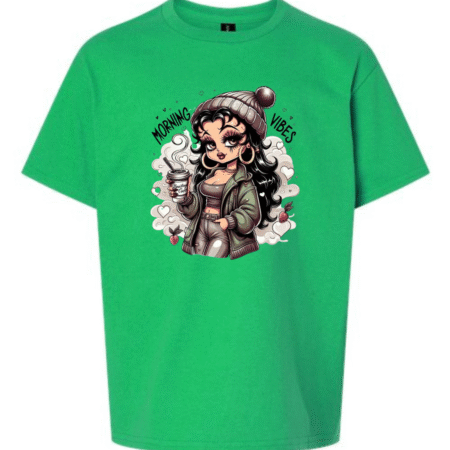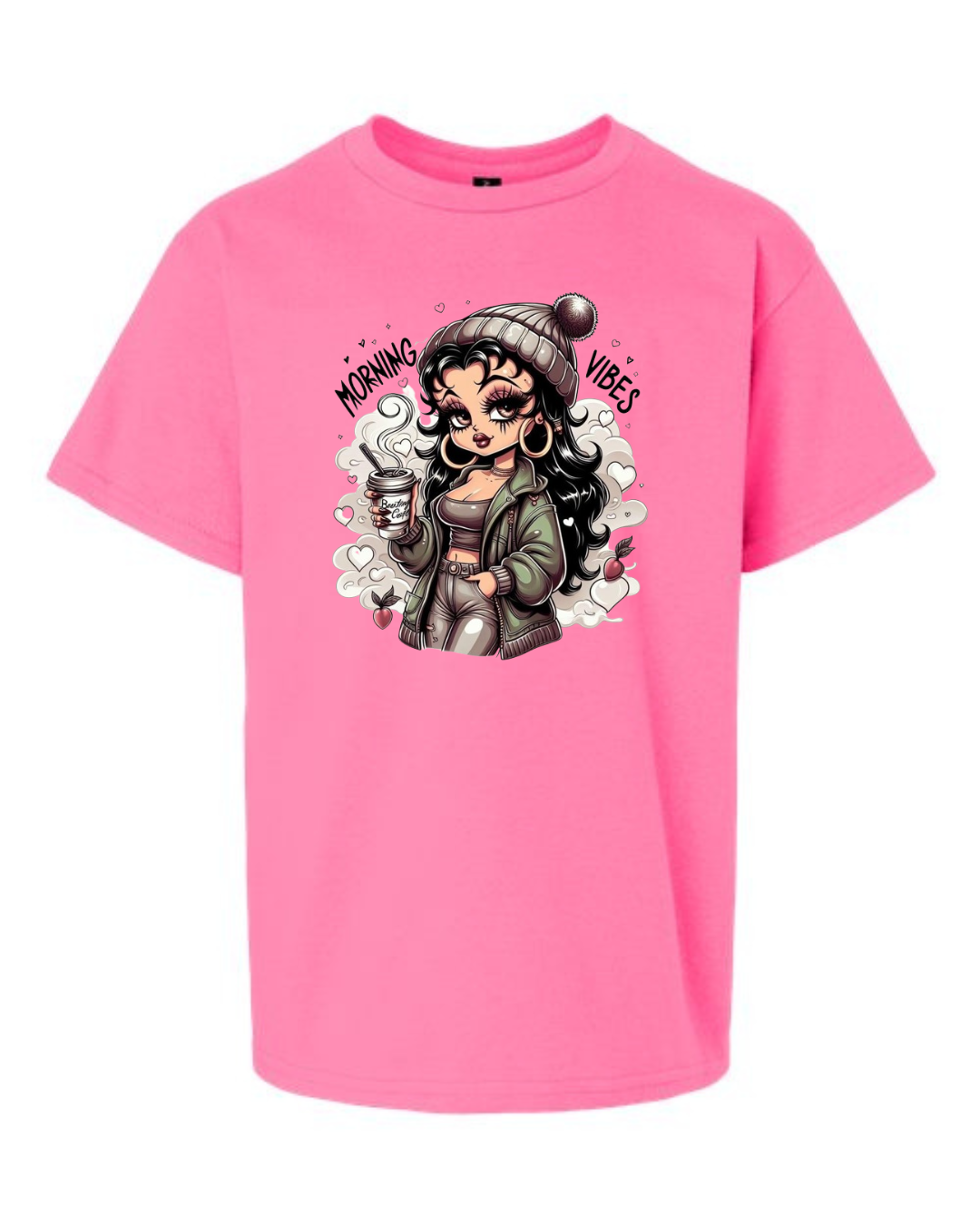 Start their day in style with this Youth Morning Vibes Graphic T-Shirt. Featuring a cozy cartoon character sipping coffee in a beanie and jacket, surrounded by whimsical steam art, this tee is perfect for kids who love cute, trendy, and cozy aesthetics. Soft, fun, and effortlessly cool.